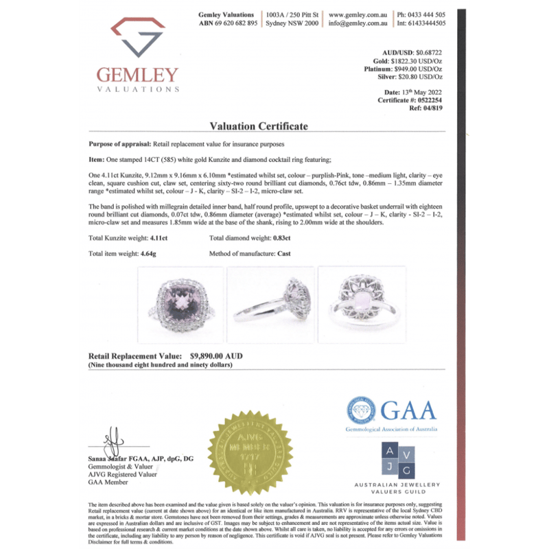 14K WHITE GOLD, KUNZITE AND DIAMOND, DOUBLE HALO RING. The Centre Features, One Square Cushion Cut, Medium Light Purplish-Pink, Kunzite (4.11Ct, Eye Clean Clarity), Claw Set. Surrounding The Centre In A Double Halo And Decorating The Band/Basket Are, 80 Round Brilliant Cut, Diamonds (0.83Ct Tdw, J-K Colour, Si2-I2 Clarity), Micro-Claw Set. Ring Size M. Valuations Provided by an Independent Third-Party Professional Not Directly Associated With Lloyds Auctions at AUD $$9,890.00This valuation has been conducted by an independent third-party professional. The valuation amount is an assessment by the issuing valuer and does not reflect the auction value of the item. Any inquiries regarding the valuation should be directed to the issuing valuer (refer to contact details on the certificate), as Lloyds Auctions has no affiliation or influence over the valuation, the valuer, or the stated amount. Condition: Good - Refer Images 0645909+1648