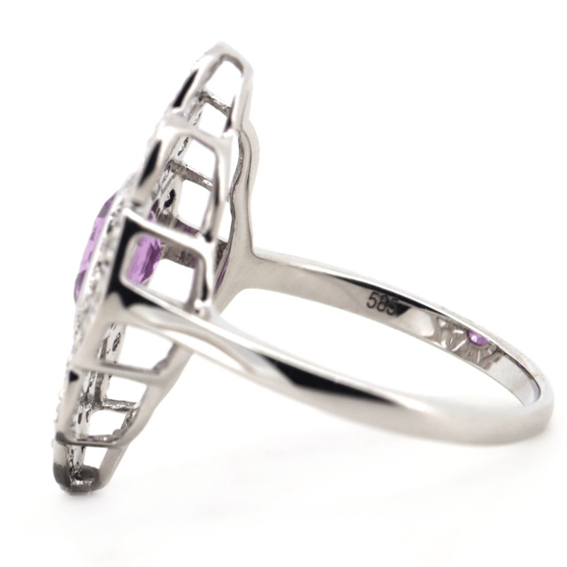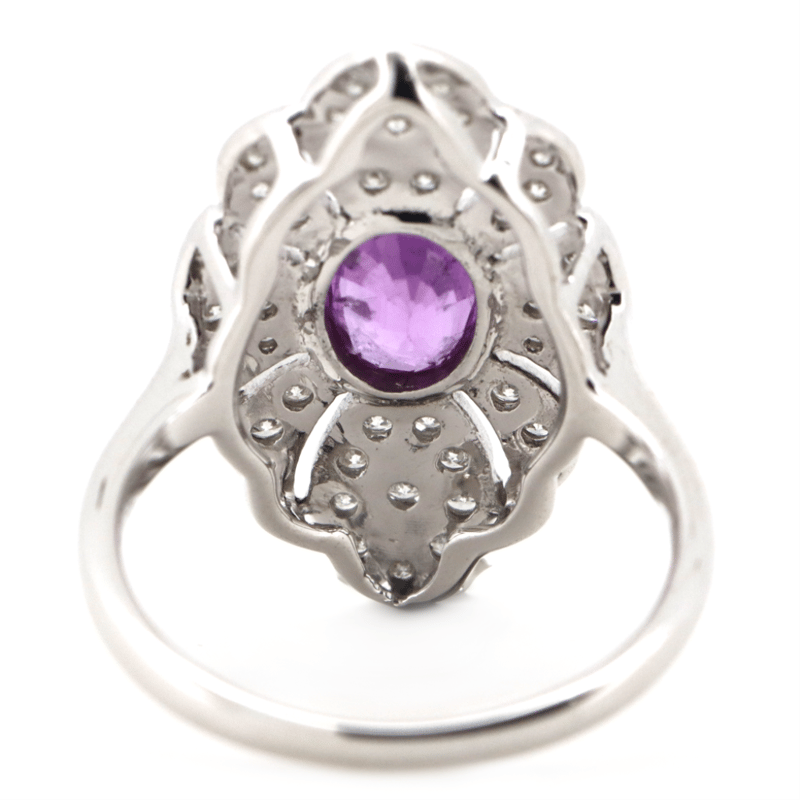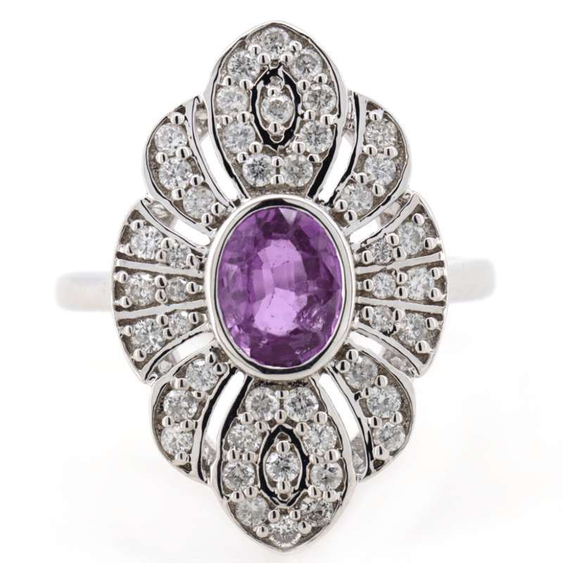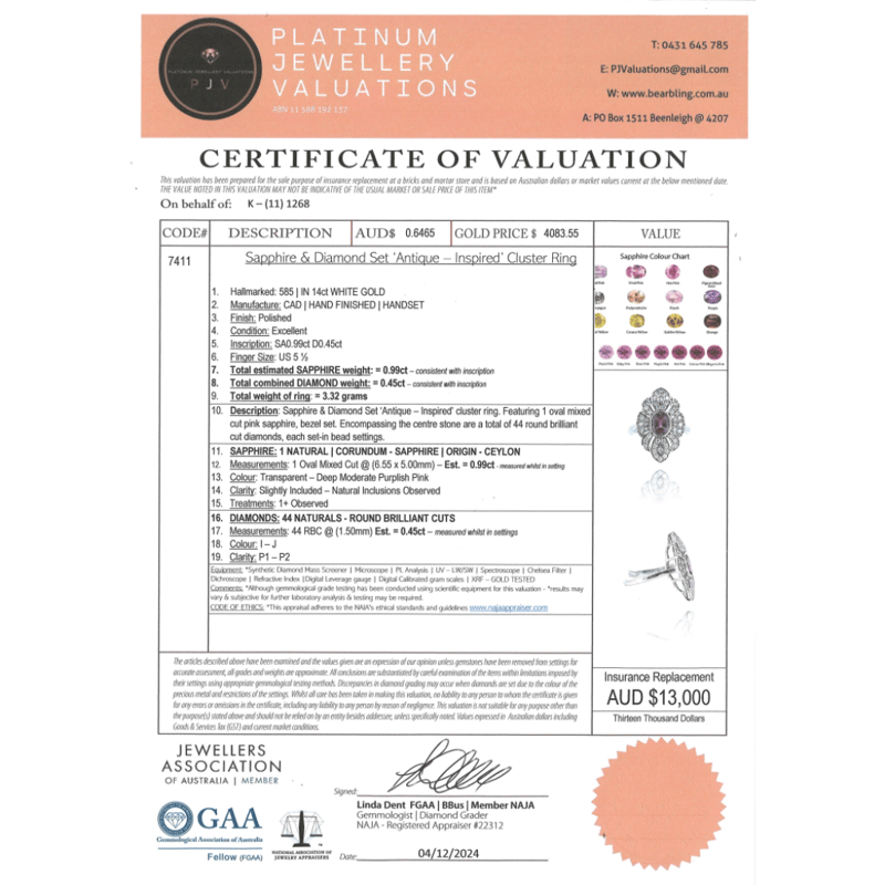 14K WHITE GOLD, PINK SAPPHIRE AND DIAMOND, CLUSTER RING. The Centre Features, One Oval Cut, Purplish-Pink Sapphire (0.99Ct, Slightly Included), Bezel Set. Encompassing The Stone Are, 44 Round Brilliant Cut, Diamonds (0.45Ct Tdw, I-J Colour, P1-P2 Clarity), Bead Set. Ring Size K1/2. Valuations Provided by an Independent Third-Party Professional Not Directly Associated With Lloyds Auctions at AUD $$13,000.00This valuation has been conducted by an independent third-party professional. The valuation amount is an assessment by the issuing valuer and does not reflect the auction value of the item. Any inquiries regarding the valuation should be directed to the issuing valuer (refer to contact details on the certificate), as Lloyds Auctions has no affiliation or influence over the valuation, the valuer, or the stated amount. Condition: Good - Refer Images 0645909+1675