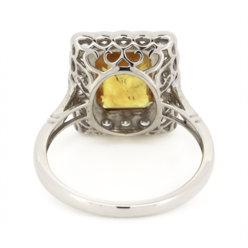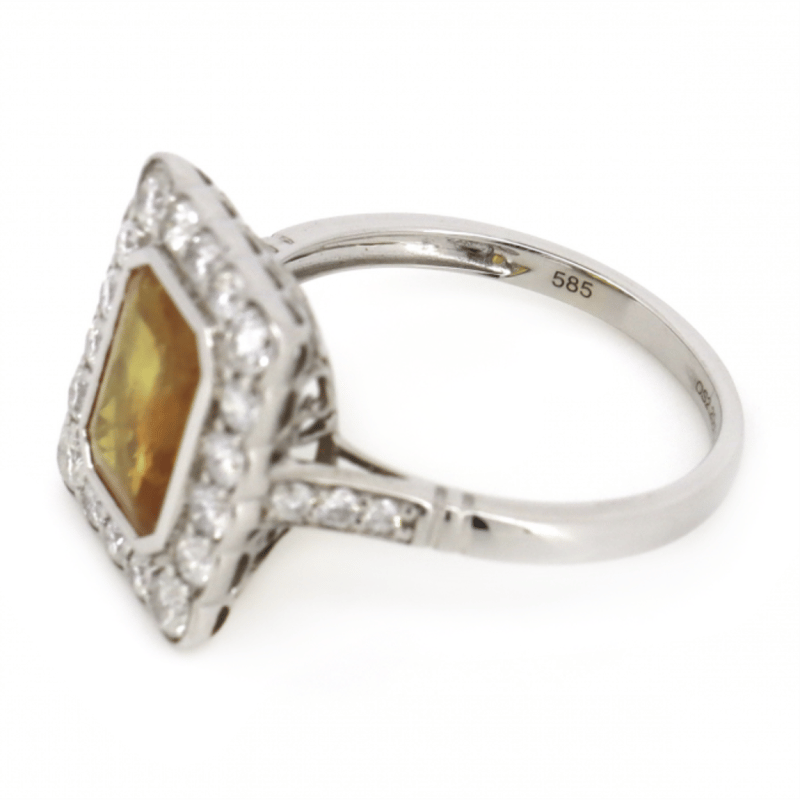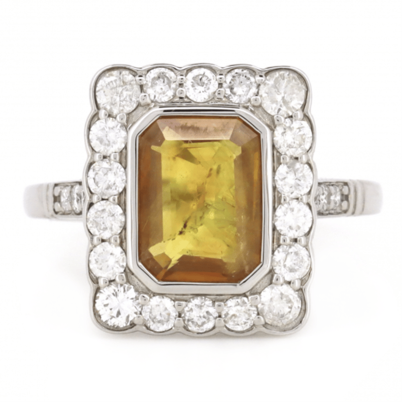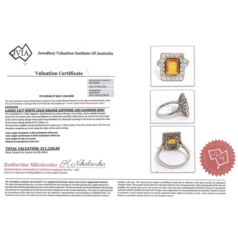 14K WHITE GOLD, ORANGE SAPPHIRE AND DIAMOND, VINTAGE INSPIRED HALO RING. The Centre Features, One Emerald Cut, Deep Orange, Sapphire (2.20Ct, Slightly Included), Bezel Set. Surrounding The Centre In A Halo And Decorating The Shoulders Are, 24 Round Brilliant Cut, Diamonds (0.824Ct Tdw, I-K Colour, Si2-P2 Clarity), Bead Set. Ring Size N 1/2. Valuations Provided by an Independent Third-Party Professional Not Directly Associated With Lloyds Auctions at AUD $$11,250.00This valuation has been conducted by an independent third-party professional. The valuation amount is an assessment by the issuing valuer and does not reflect the auction value of the item. Any inquiries regarding the valuation should be directed to the issuing valuer (refer to contact details on the certificate), as Lloyds Auctions has no affiliation or influence over the valuation, the valuer, or the stated amount. Condition: Good - Refer Images 0645909+1686
