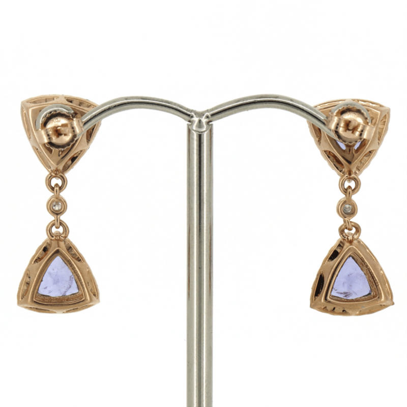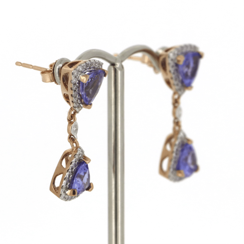 14K ROSE GOLD, TANZANITE AND DIAMOND, DOUBLE DROP HALO EARRINGS.