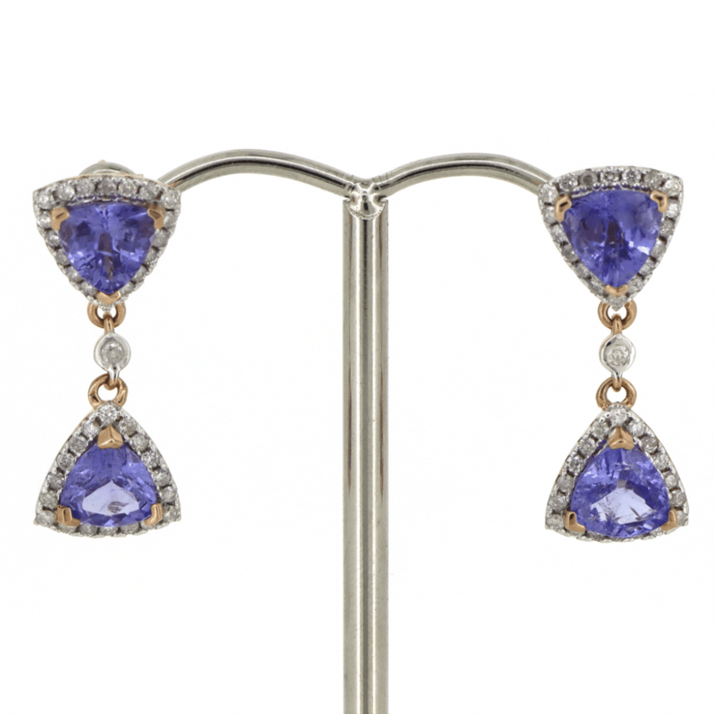 The Centres Feature, 4 Trillion Cut, Purplish-Blue, Tanzanites (3.60Ct Tsw, Minor-Moderate Eye Visible Inclusions), Prong Set. Surrounding The Stones In Individual Halos And Decorating The Joins Are, 74 Round Brilliant Cut, Diamonds (0.54Ct Tdw, J-K Colour, Si2-I2 Clarity), Bezel/Micro-Claw Set In White Gold. The Earrings Have Post Backs With 14K Rose Gold Butterfly Clasps.