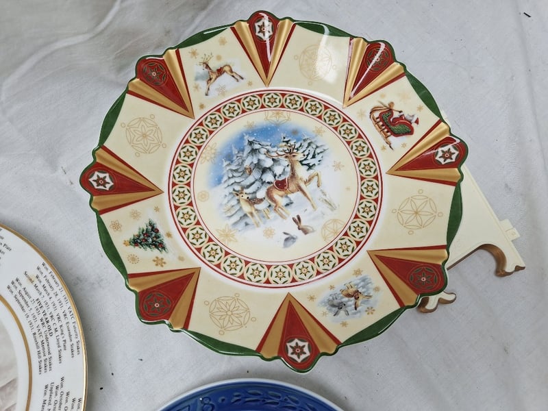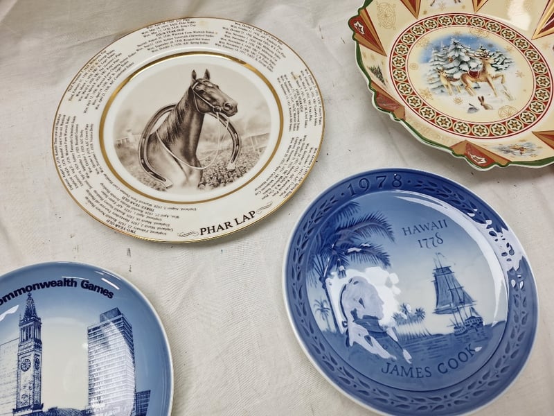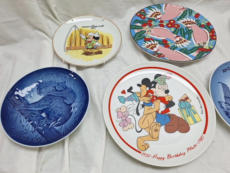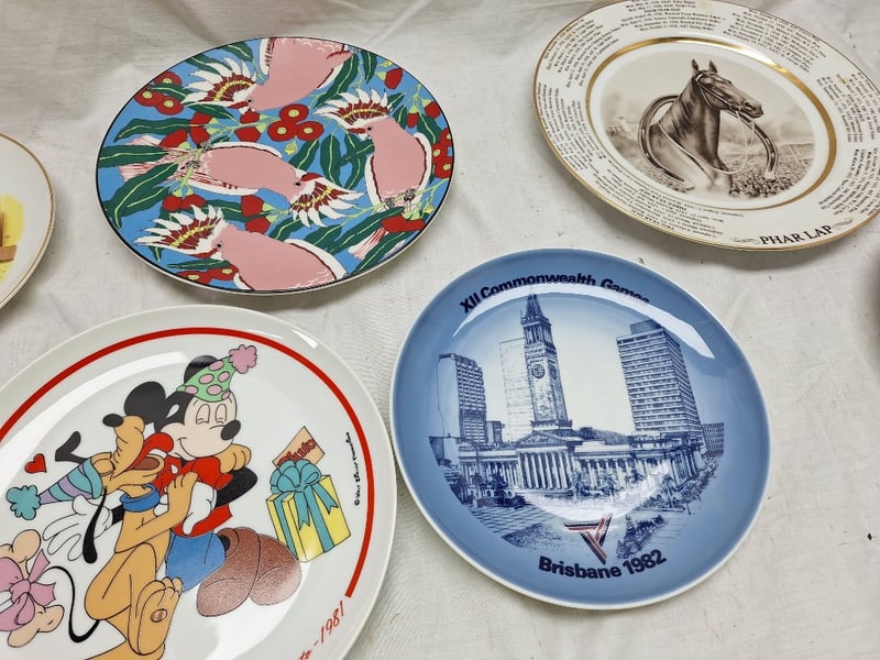 COLLECTION OF DECORATIVE COLLECTOR PLATES - MIXED THEMES AND ORIGINSItem Size: Height: 40cm, Width: 40cm, Depth: 40cm, Weight: 15KgDiverse Collection Of 8 Decorative Plates Featuring Commemorative, Disney, Equestrian, Floral, And Architectural Themes. Includes Blue And White Porcelain Plates With Commonwealth Games And Hawaiian Imagery, Mickey Mouse Club Memorabilia From 1955, Pluto Birthday Plate From 1981, Hand-Painted Floral Designs On Pink Grounds, Horse Portrait Plates With Text Borders, And An Elaborate Scalloped Christmas-Themed Plate With Red And Gold Detailing. Mixed Manufacturers And Periods Spanning Mid-20Th CentCondition: Good - Refer To Images586298+4