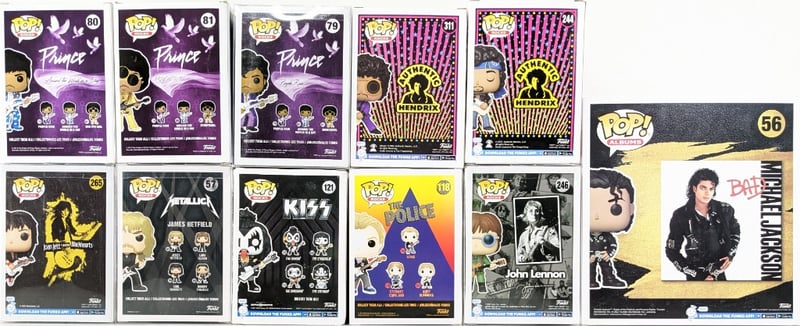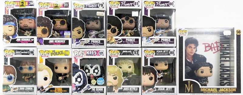 COLLECTION OF ASSORTED FUNKO POP! VINYL. QTY 11.Item Size: Height: 16.2cm, Width: 11.8cm, Depth: 9.2cm, Weight: 1KgFunko Pop! - Michael Jackson #56, Authentic Hendrix - Jimi Hendrix #311, Jimi Hendrix Maui Live #244, The Police - Sting #118, John Lennon #246, Kiss - The Demon #121, Metallica - James Hetfield #57, Joan Jett And The Blackhearts - Joan Jett #265, Prince #79, Prince #80, And Prince #81.Condition: Good - Refer To ImagesFC2A990895+2