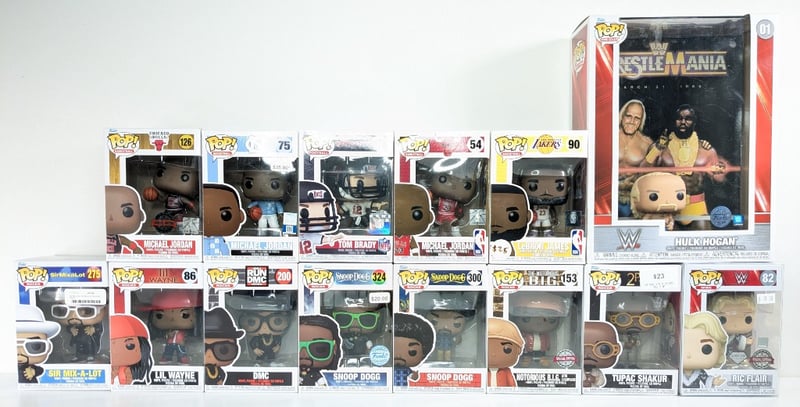 COLLECTION OF ASSORTED FUNKO POP! VINYL. QTY 14Item Size: Height: 16.2cm, Width: 11.8cm, Depth: 9.2cm, Weight: 1KgFunko Pop! - Wrestle Mania - Hulk Hogan #01, Ric Flair $82, Sir Mix-A-Lot #275, Dmc #200, Lil Wayne #86, Tupac Shakur #252, Snoop Dog #300, Snoop Dogg #324, The Notorious B.I.G #153, Tom Brady #170, Michael Jordan #126, Michael Jordan #54, Michael Jordan #75, And Lebron James #90.Condition: Good - Refer To ImagesFC2A990895+4