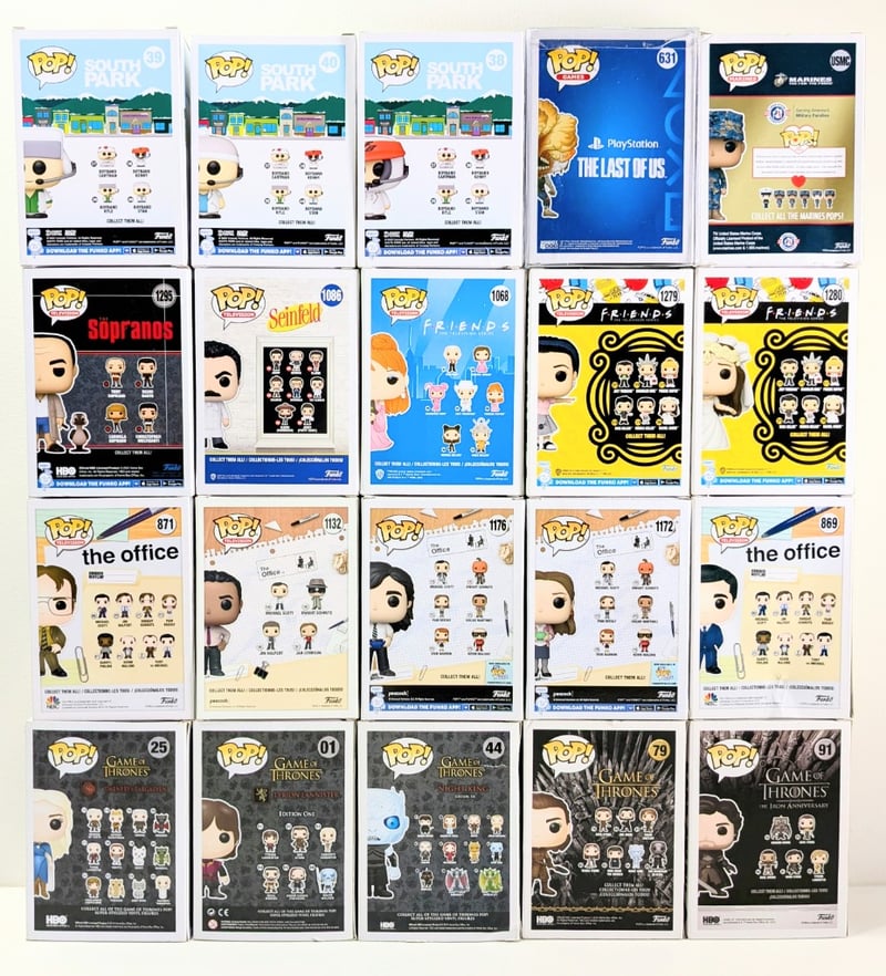 COLLECTION OF ASSORTED FUNKO POP! VINYL. QTY 20.Item Size: Height: 16.2cm, Width: 11.8cm, Depth: 9.2cm, Weight: 1KgFunko Pop! The Office - Oscar Martinez #1132, Pam Beesly #1172, Dwight Schrute #871, Michael Scott #1176, Michael Scott #869, Clicker #631, Marine #Usmc, Sienfeld - Yev Kassem #1086, The Sopranos - Tony Soprano With Duck #1295, South Park - Boyband Kenny #38, Boyband Kyle #39, Boyband Stan #40, Friends - Monica Geller #1279, Phoebe Buffay #1086, Rachel Green #1280, Game Of Thrones - Night King #44, Robb Stark #91, Daenerys Targaryen #25, Tyrion Lannister #01, And Arya Stark #79.Condition: Good - Refer To ImagesF2CA990895+6