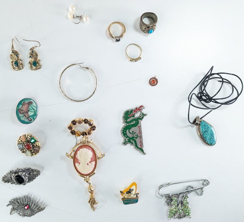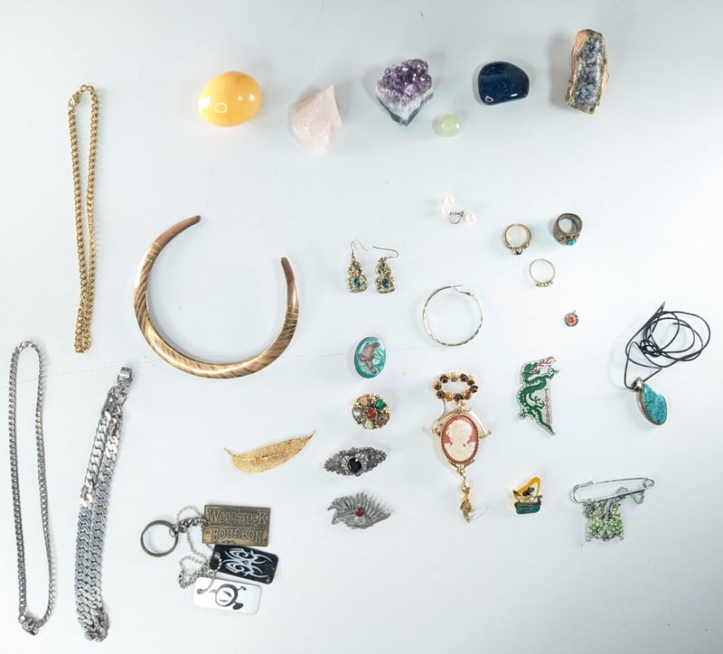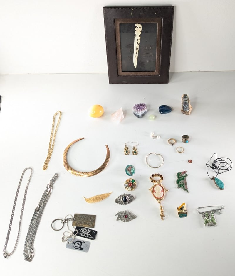 ASSORTED JEWELRY AND DECORATIONS.Item Size: Height: 1cm, Width: 1cm, Depth: 1cm, Weight: 1KgStones, Crystals, Rings, Earrings, Necklaces, Pins And Framed 'Ivory' Letter Opener.Condition: Good - Refer To ImagesFC2C163026+10