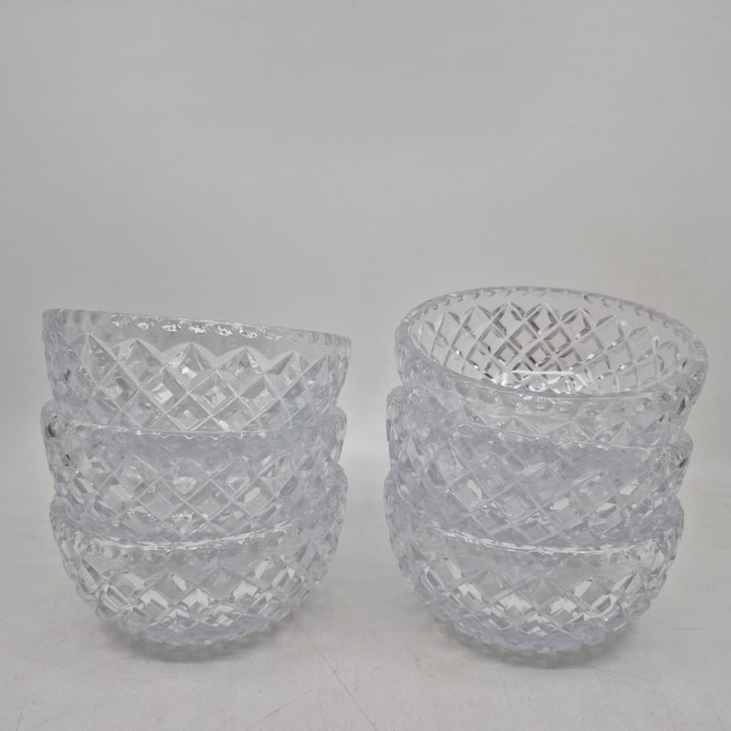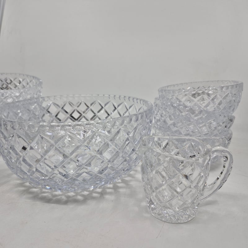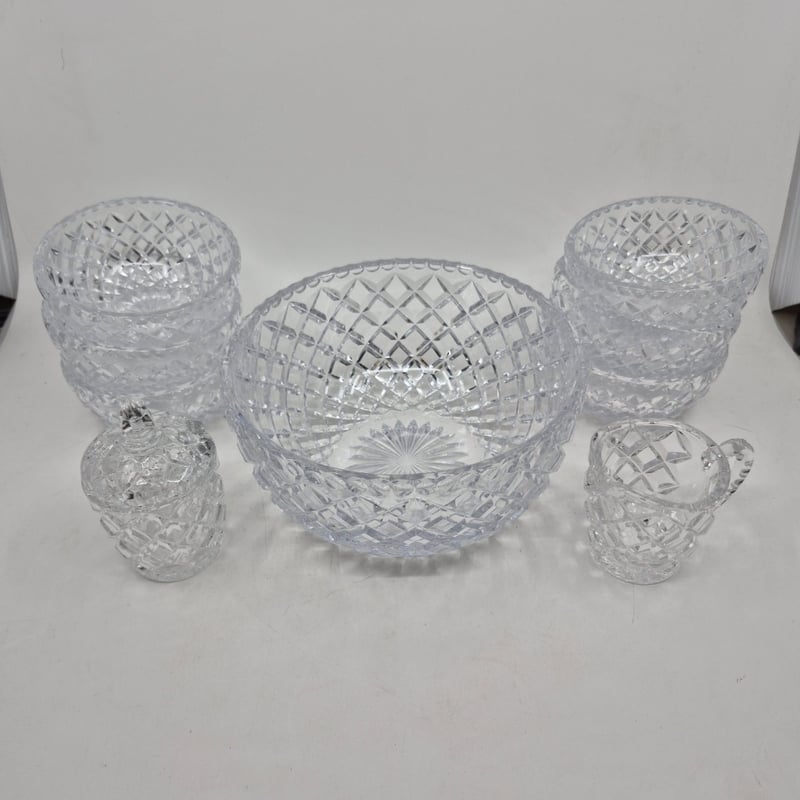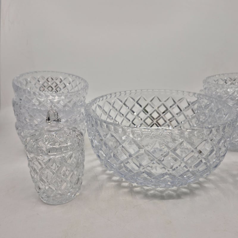 CRYSTAL GLASSWARE SET WITH SERVING BOWLS AND CONDIMENT VESSELS 1 Large Bowel, 6 Small Bowls And 2 Condiment Vessels Condition: Good - Refer To Images 586235+1