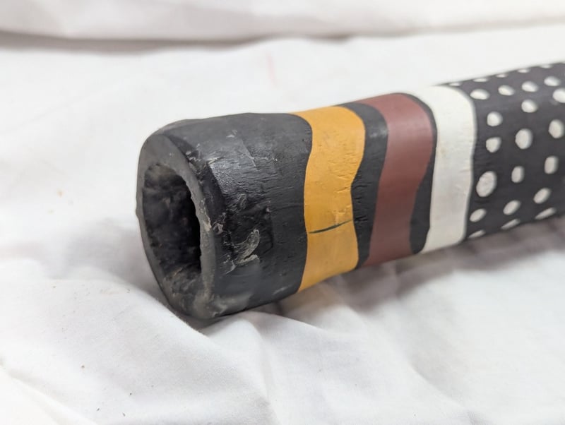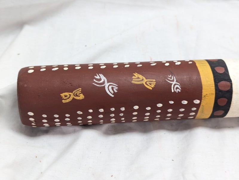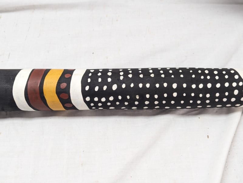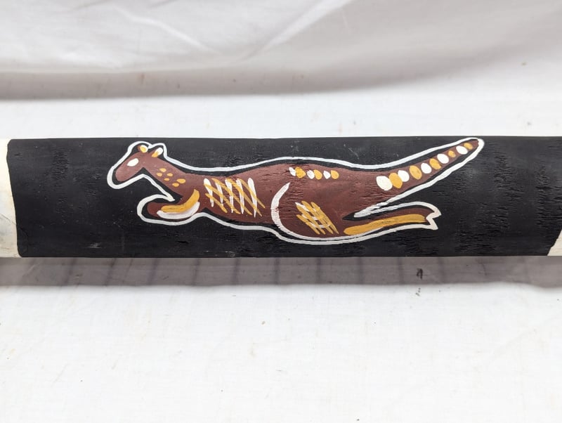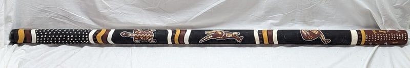 DIDGERIDOO WITH PAINTED ABORIGINAL STYLE DESIGN Painted Exterior With Native Animal Imagery, Item Length Approx: 150Cm Condition: Good - Refer To Images 10B 586296+3