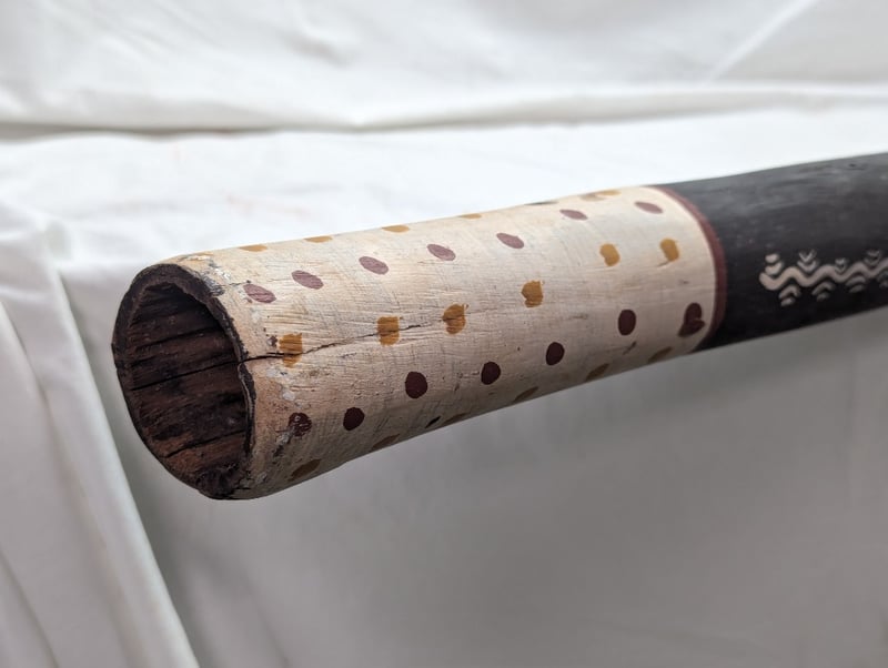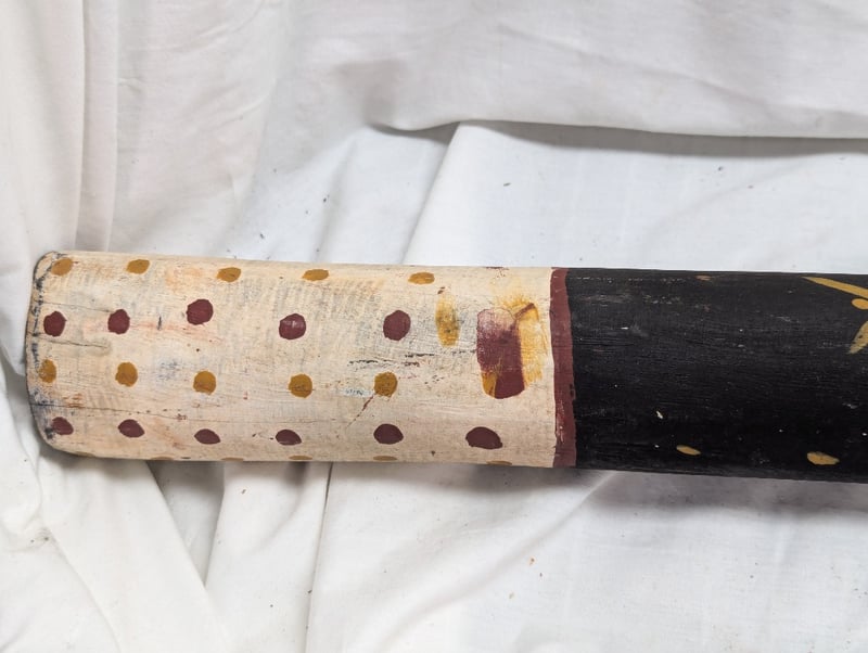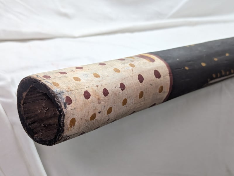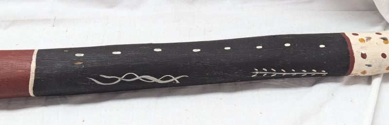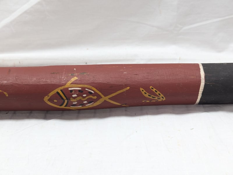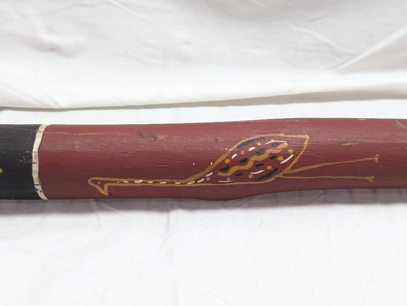 DIDGERIDOO WITH PAINTED ABORIGINAL STYLE DESIGN Exterior Features Earth Colours With Various Animal Style Imagery, Item Length Approx: 157Cm 10B 586296+4