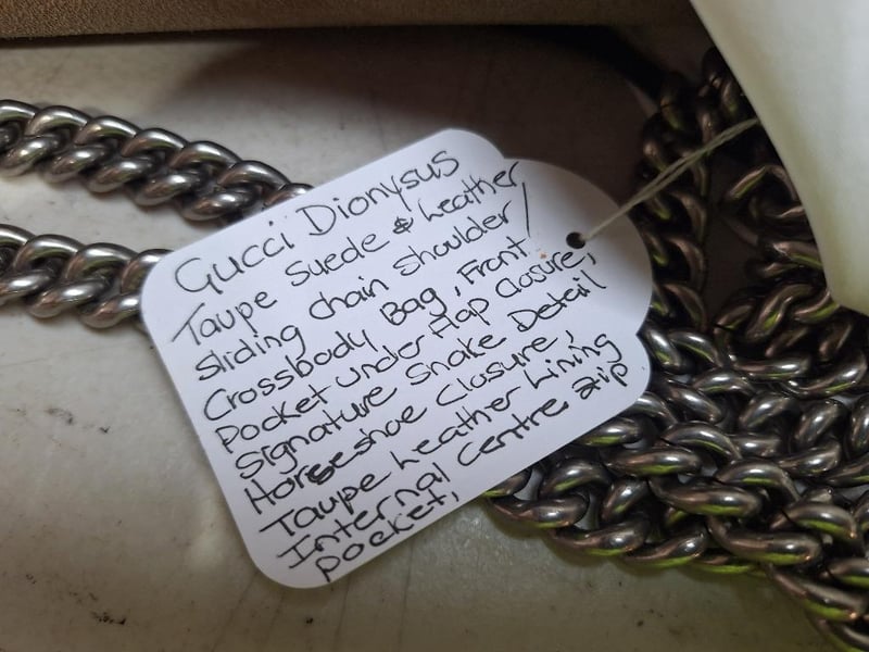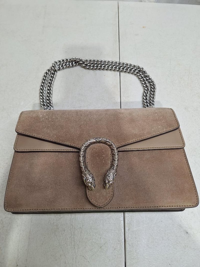 GUCCI Dionysus taupe suede & leather sliding chain shoulder/crossbody bag front pocket under flap closure with signature snake detail horseshoe closure, taupe leather, 1 internal zip pocket with 2 internal compartments, silver tone hardware, measures L:26.5 x H:16.5 x D:8.5cm, comes with third party authenticity certificate included, in GUCCI dust cover