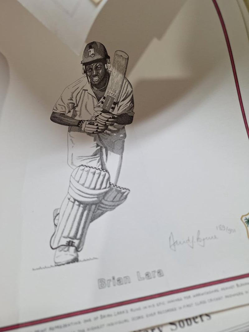 Collectable Cricket memorbillia, 3 x "Sir Garfiled Sobers Cricketer Supreme" Limited edition prints, 135/500, 144/500, 146/500, By D.J.Bryne, 1 x " Brian Lara" limited edition print, 189/501, by D.J.Byrne, 1 x " Allan Border A Cut Above" limited edition print 106/250, by D.J.Bryne, 1 x " Shane Warne The Wizard From Oz" limited edition print 48/500 By D.J.Bryne, 3 x " The Lords Pavilion The Hard Press" prints by David Gentleman 86', and a variety of signed photos / badge
