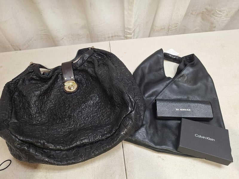 1 x MARC JACOBS black lamb leather Hobo bag, monogram embossed leather, single top handle in dark brown leather, dark brown leather fold over strap with snap lock closure, multi coloured textile lining with internal zip pocket & 2 slip pockets, measures L:42 x H:35 x D:14cm in dust cover, 1 x MM6 MAISON MARGIELA Paris black shoulder bag, MM6 leather top handle, black textile lining,measures L:33.5 x H:25 x D:1cm, 1 x CALVIN KLEIN card holder, grey with black interior, 6 card compartment, RRP$69.00, NEW in box with tags, 1 x BURBERRY reading glasses, B1313-Q, Burberry signature design on arms in Burberry hard case