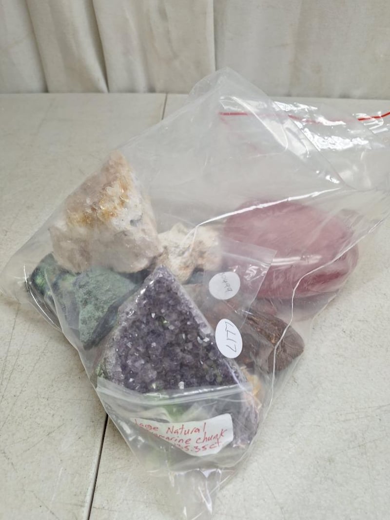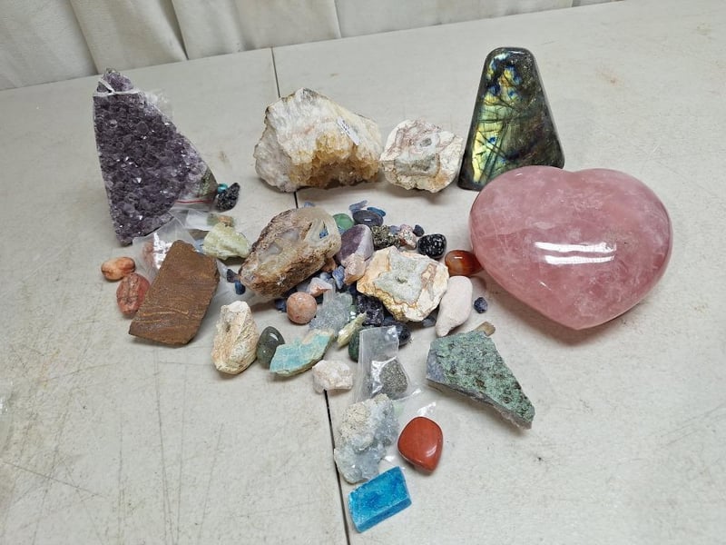 Variety of Quartz and gemstones, including uncut Aquamarine, white jade