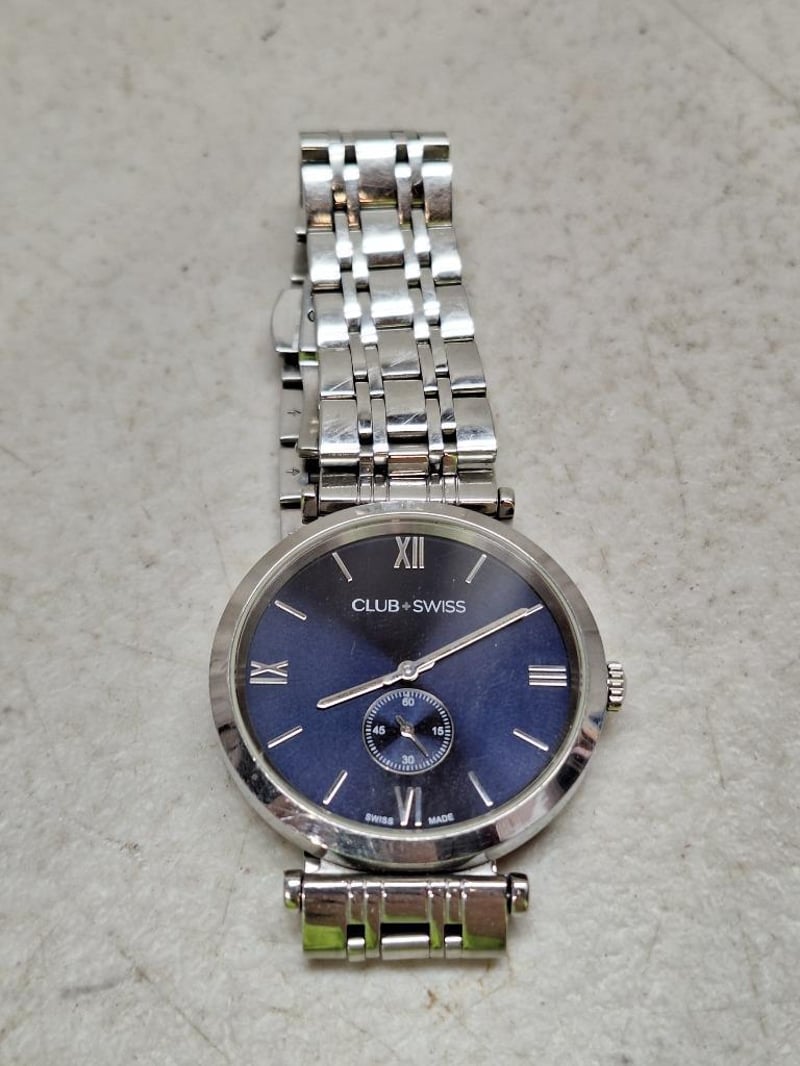 1x COACH aviator sunglasses, HC7143(CD467)T, black lenses and titanium frame, 1x Tungsten carbide men's ring, V ring size, in box, 1x ONISS men's chronograph watch, black dial with date display and silver tone hour markers, 5ATM, stainless steel/tungston, fold-over snaplock closure, 1x CLUB SWISS men's watch, blue dial with roman numeral and silver tone hourmarkers, 38TM, swiss made, stainless silver, fold-over snaplock closure, 1x men's leather and sterling silver bracelet, marked 925, lenght 20cm