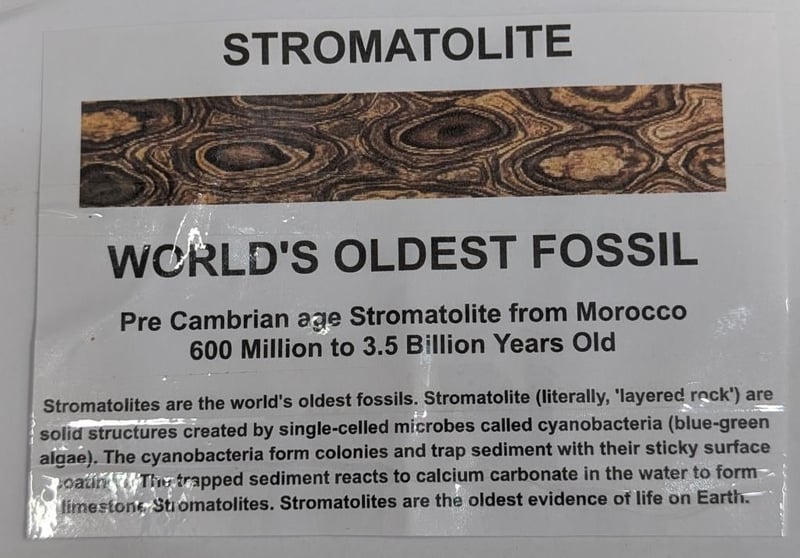PRE CAMBRIAN AGE STROMATOLITE FROM MOROCCO. THE WORLDS OLDEST FOSSIL.World'S Oldest Fossil - Pre Cambrian Age Stromatolite From Morocco 600 Million To 3.5 Billion Years Old Stromatolites Are The World'S Oldest Fossils. Stromatolite (Literally, 'Layered Rock') Are Solid Structures Created By Single-Celled Microbes Called Cyanobacteria (Blue-Green Algae). The Cyanobacteria Form Colonies And Trap Sediment With Their Sticky Surface Coatings. The Trapped Sediment Reacts To Calcium Carbonate In The Water To Form Limestone Stromatolites. Stromatolites Are The Oldest Evidence Of Life On Earth.Condition: Good - Refer To Images586333+11