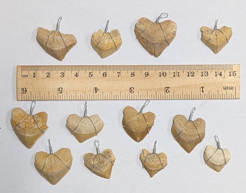 DOZEN 70 MILLION YEAR OLD FOSSIL SHARK TEETH WIRE WRAPPED PENDANTSShark Species Is Squalicorax. It Was A Coastal Shark That Lived Around 70 Million Years Ago And Had A Worldwide Distribution. It Has The Nickname "Crow Shark" Because Besides Hunting It Was A Scavenger (Like A Crow). It Grew To Three Meters Long. These Teeth Were Dug Out Of The Phosphate Mines In Morocco. The Moroccan Phosphate Fields Were Laid Down Between Roughly 93 And 33 Million Years Ago And You Often See Fossils Buried Together That Are Millions Of Years Apart. Many Kinds Of Fossils Are Found Including Shark, Stingray, Turtle, Snake, Mosasaur, Various Fish, Lizards Etc. The Moroccan Phosphate Mines Is Probably The Most Fossil Rich Area On EarthCondition: Good - Refer To Images586333+42