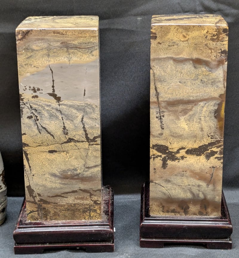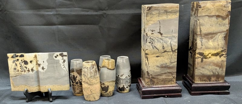COLLECTION OF CHINESE PAINTING STONE DECOR Includes Large Stones, Vases, And Stone Book Display Large Stone Dimensions Approx: 13Cm (W) X 32Xm (H) X 13Cm (D) Small Stone Dimensions Approx: 12Cm (W) X 8Cm (H) X 3Cm (D) Stone Book Dimensions: 21Cm (W) X 13Cm (H) X 3Cm (D) Note: Minor Imperfections In Vases Condition: Good - Refer To Images 584408+5