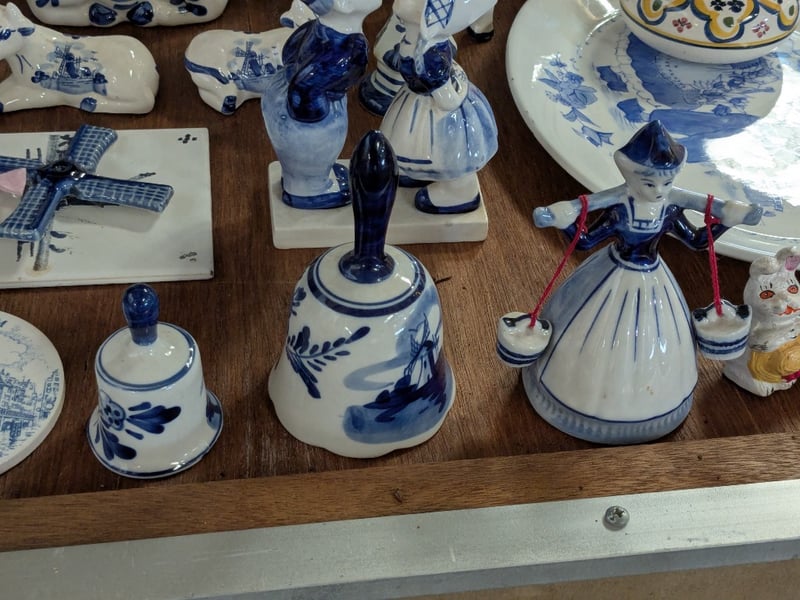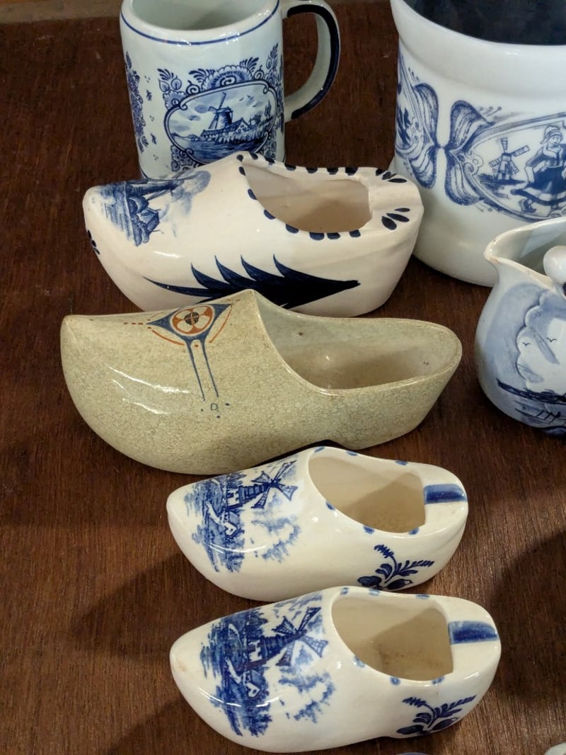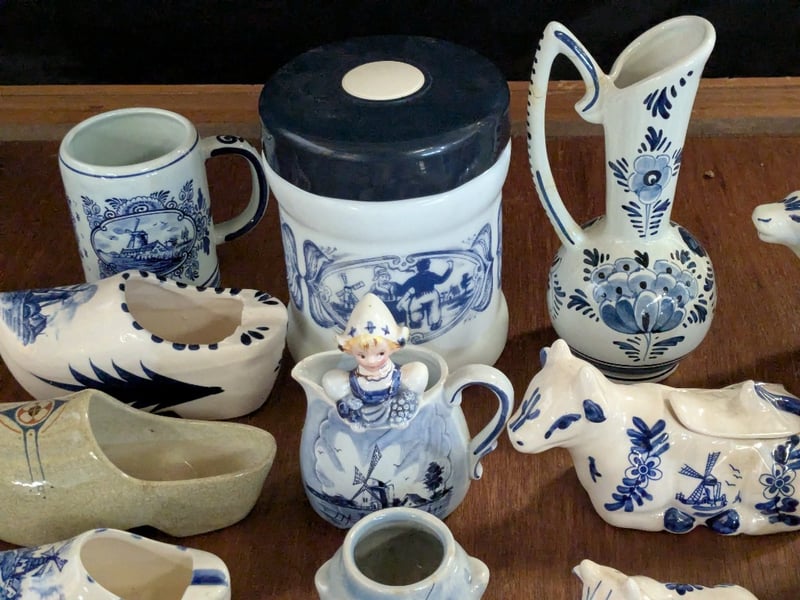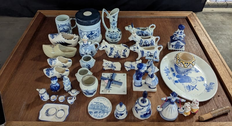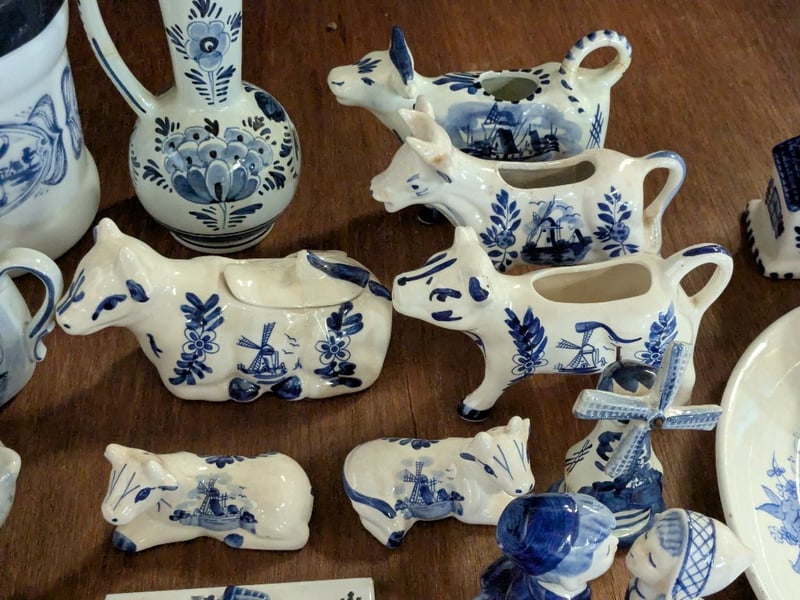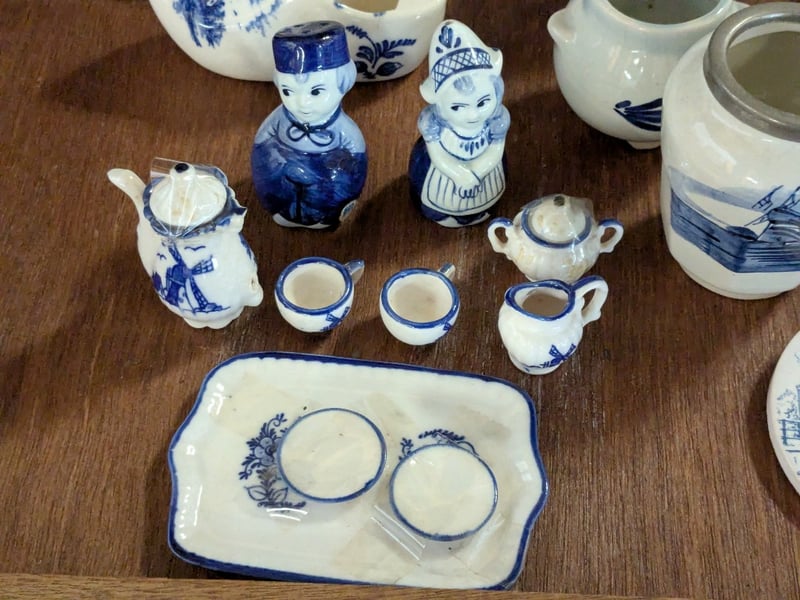 COLLECTION OF DELFTWARE AND HOME DECORIncludes Clog Sets, Ornamental Cow Sets, Bells, Miniature Tea Cup Set, Etc.Condition: Good - Refer To Images585003+30