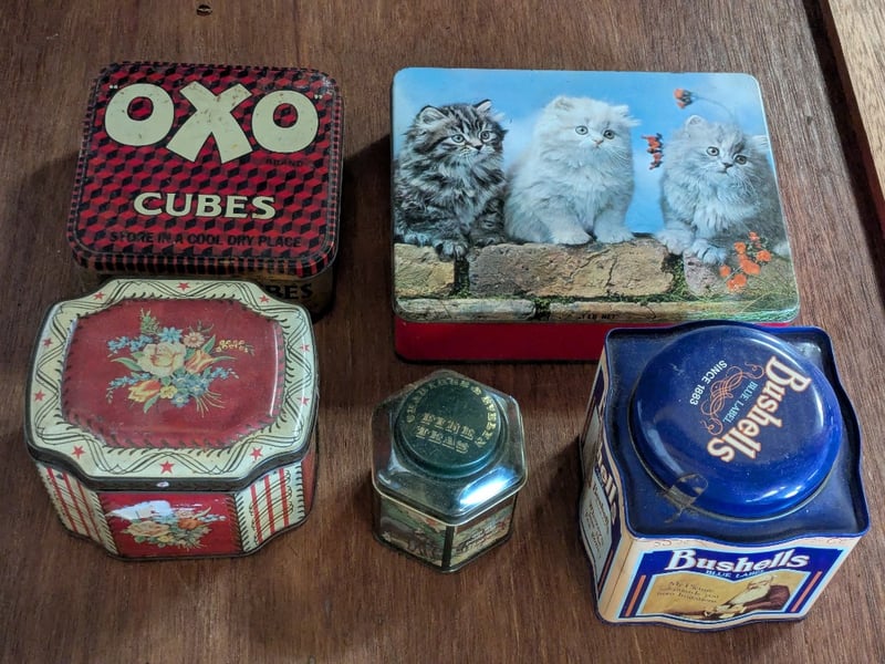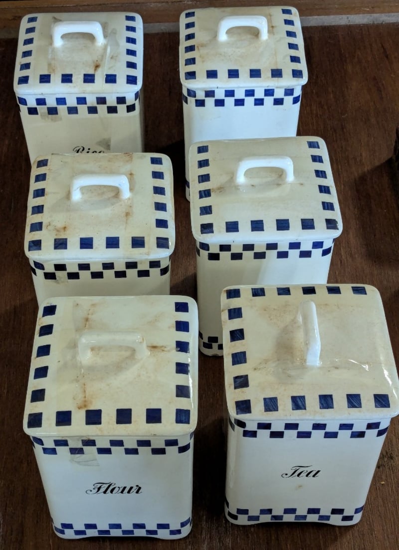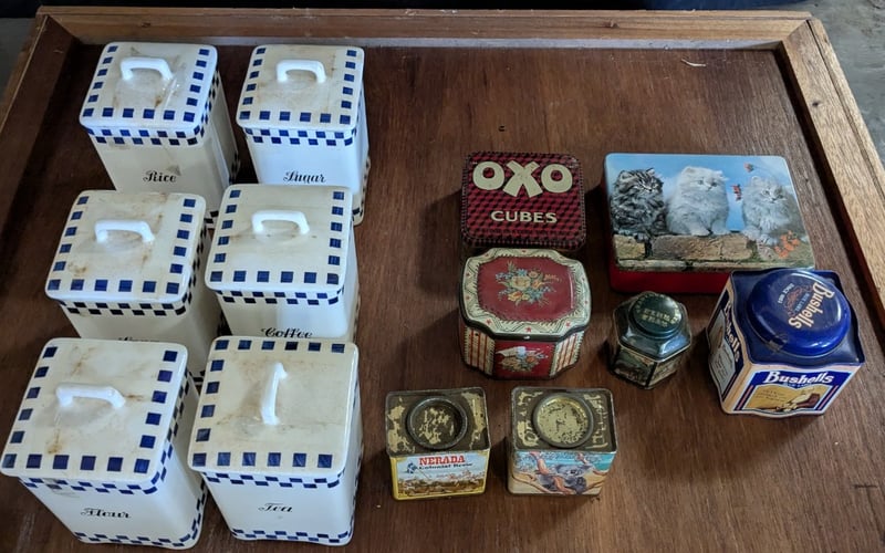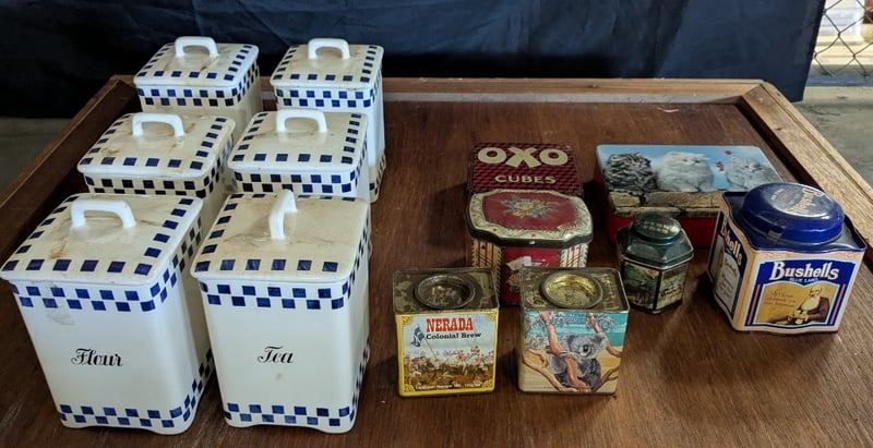COLLECTION OF KITCHEN TINSIncludes Six Ceramic Jars And Lids, Bushells Blue Label Tin, Nerada Colonial Brew, Oxo Cubes Tin, EtcCondition: Good - Refer To Images585003+34