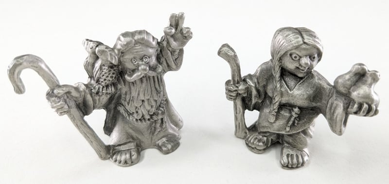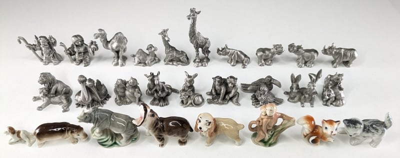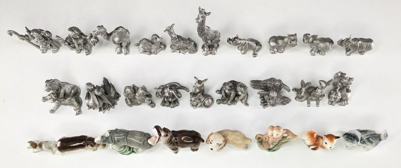 HUDSON FINE PEWTER FIGURINES OF NOAH AND HIS WIFE FROM THE NOAH'S ARK COLLECTION & SET MINIATURE CERAMIC ANIMAL FIGURINES.
