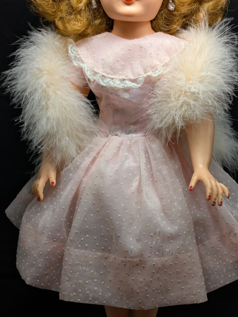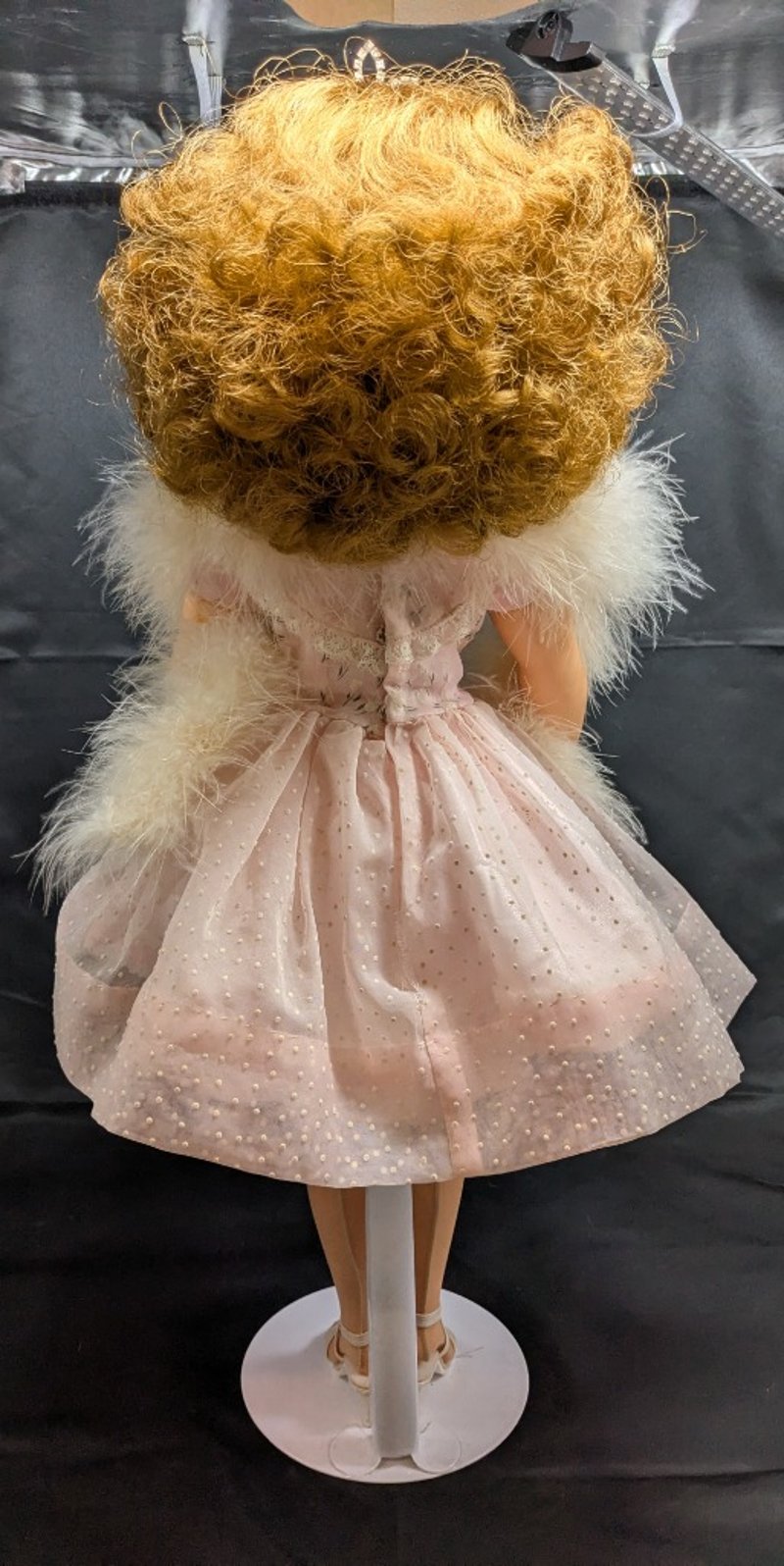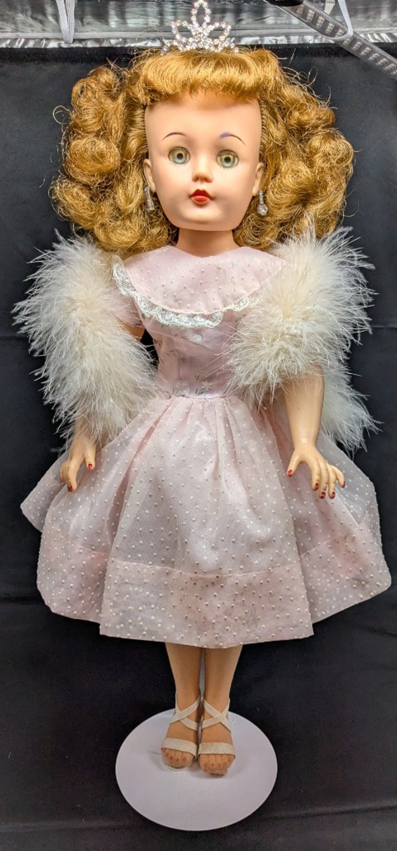 IDEAL MISS REVLON "MISS DEBUTANT" DOLL WITH STAND AND ACCESSORIESItem Size: Height: 58cm, Width: 37cm, Depth: 20cmFeatures Include Diamonté Tiara, Diamonté Rhinestone Earrings, Feather Stole, Satin Slip, Swivel Waist, Revlon Stockings And White ShoesCondition: Good - Refer To Images585049+24