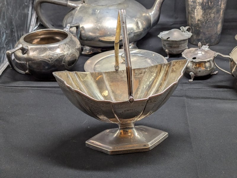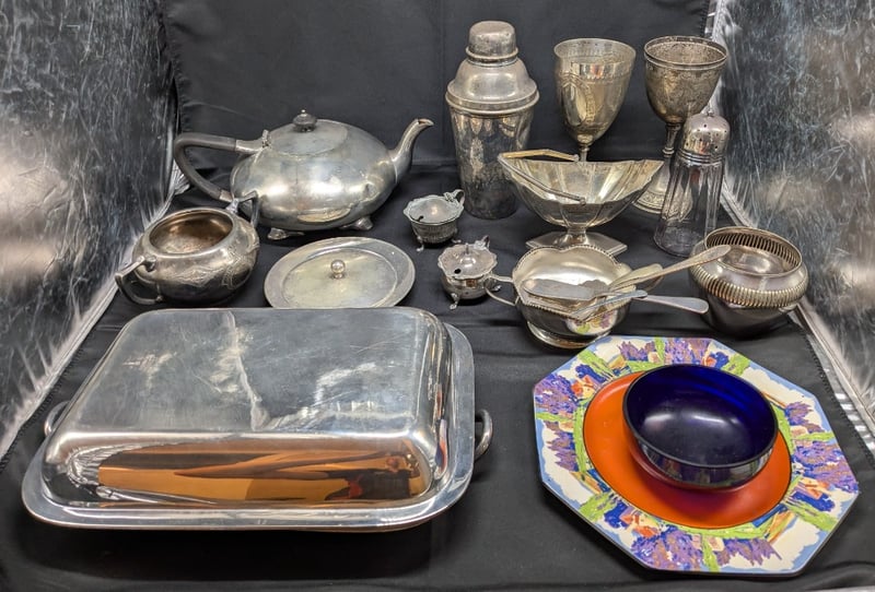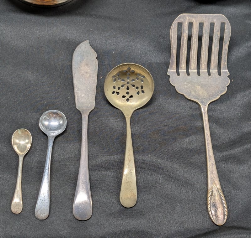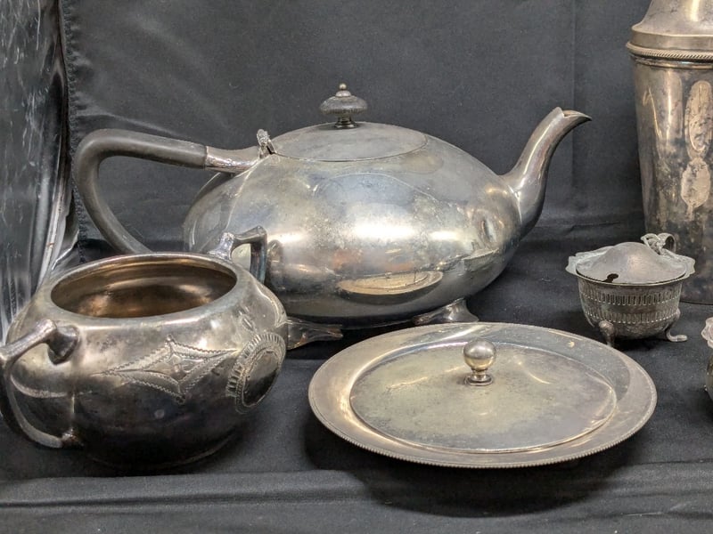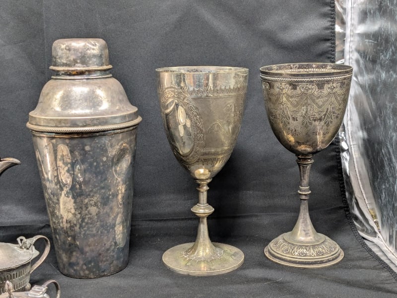 COLLECTION OF SILVER-PLATED HOLLOWARE AND CUTLERYIncludes Serving Trays, Various Cutlery, Teapot, Chalices, EtcCondition: Fair - Refer To Images584402+6