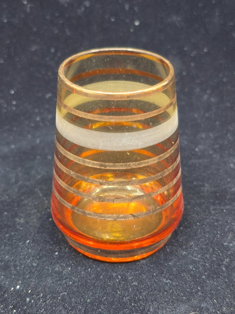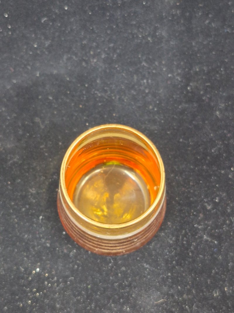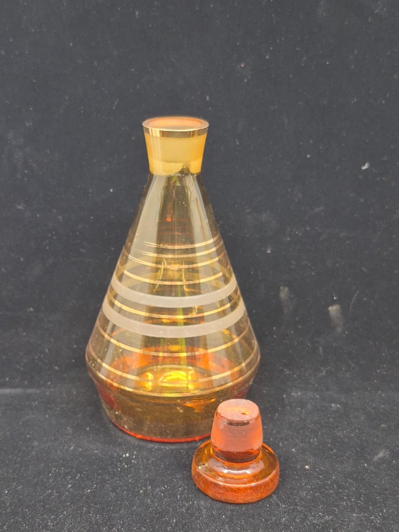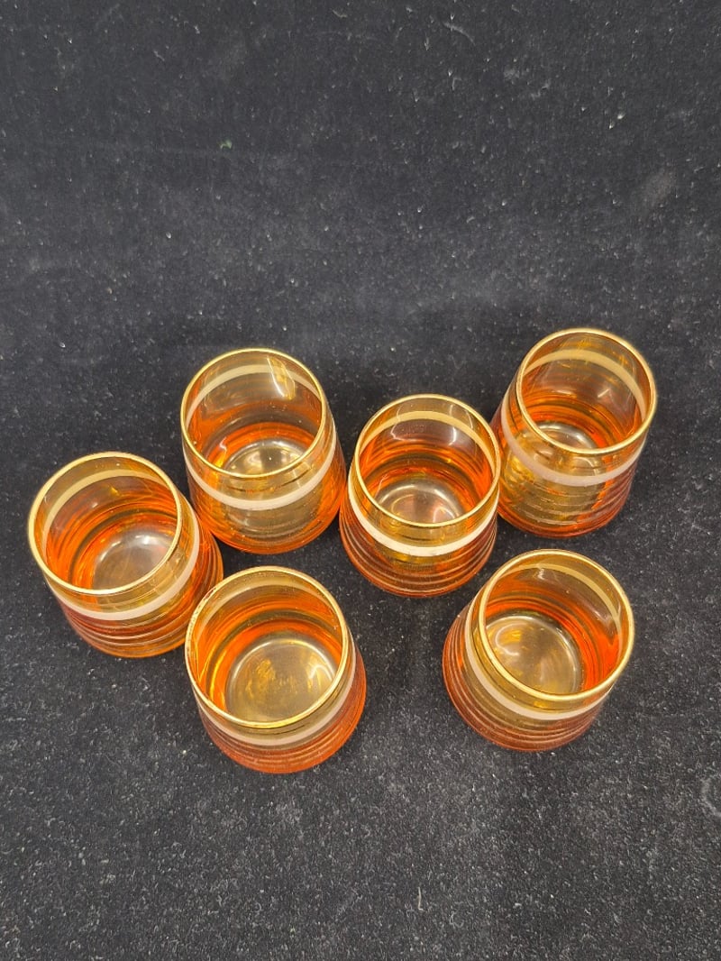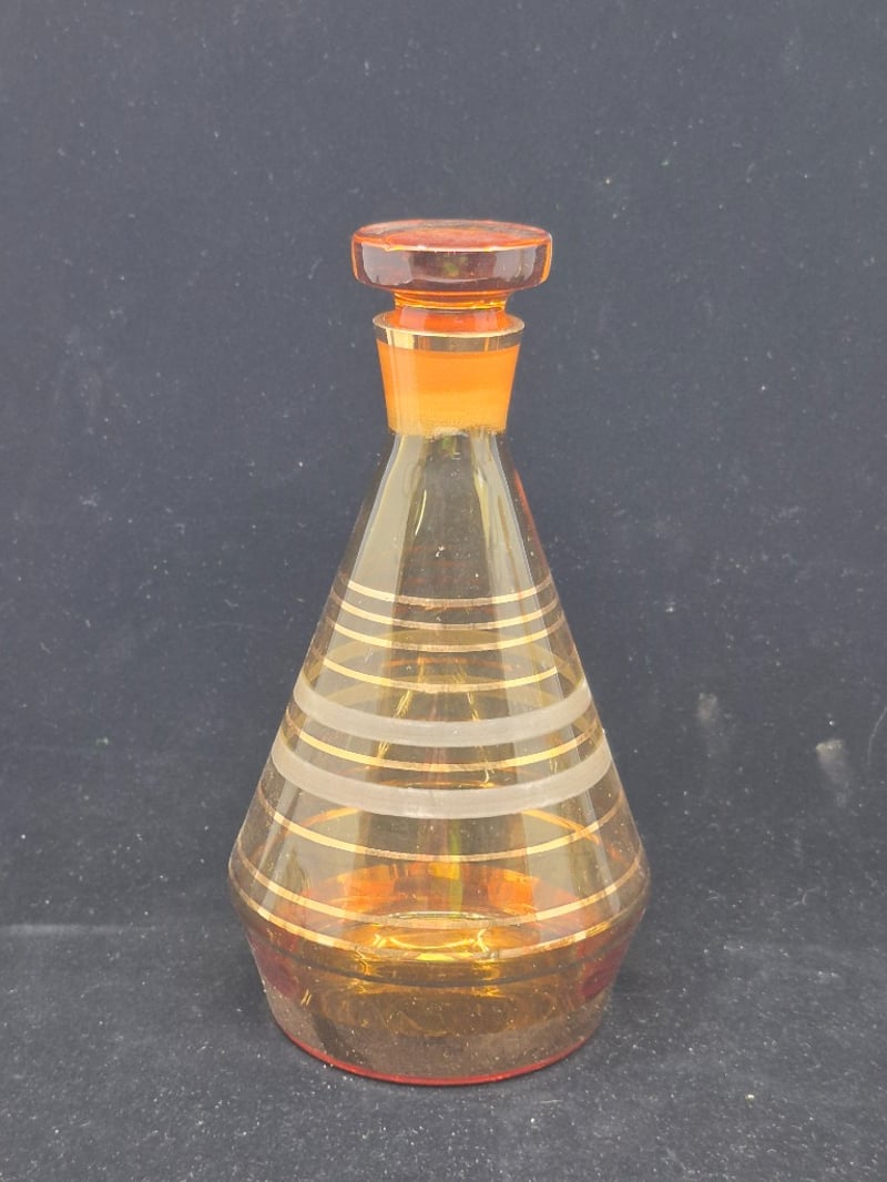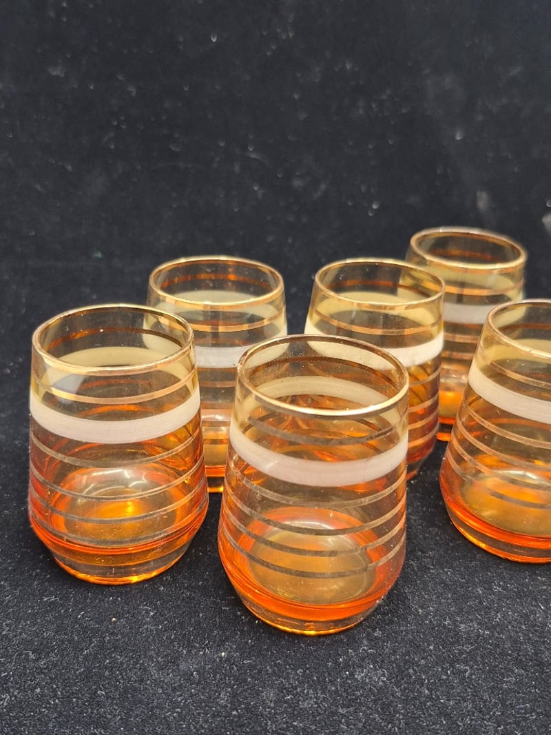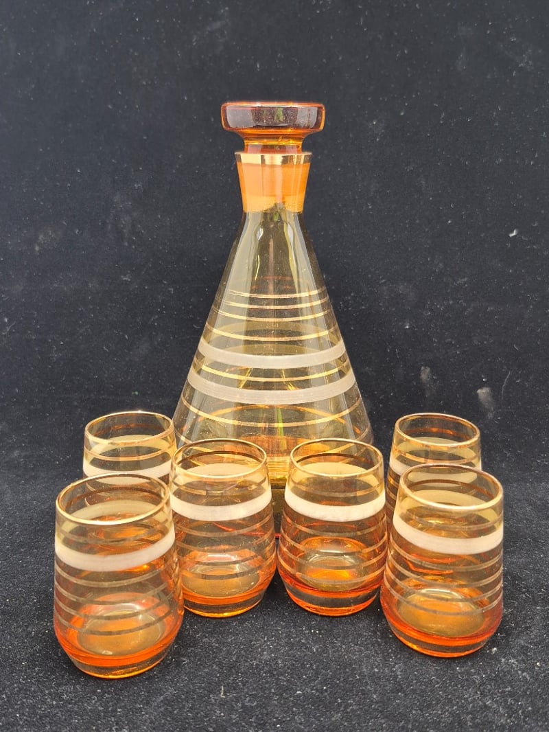 AMBER GLASS DECANTER SET WITH EIGHT MATCHING GLASSESPurchased In EgyptCondition: Good - Refer To Images6C586337+4