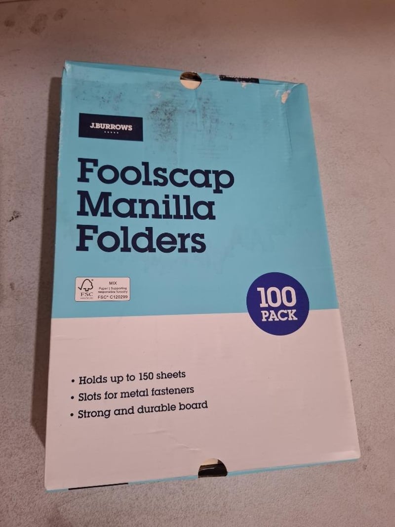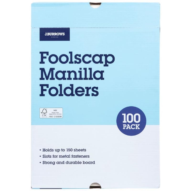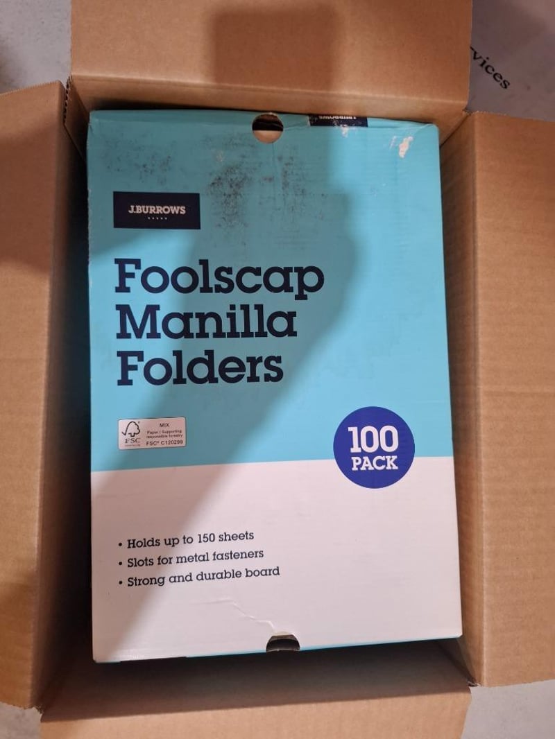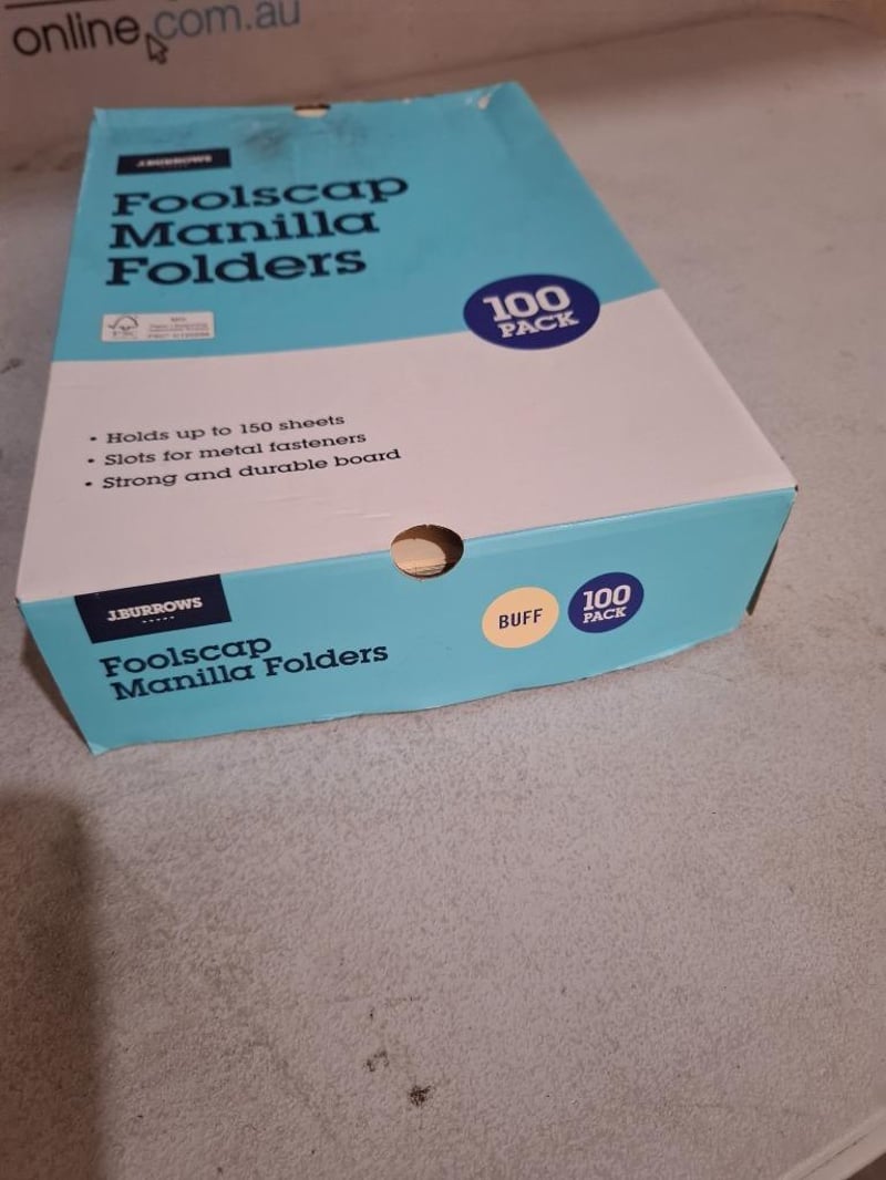 RRP $90.00ea J.Burrows Manila Folder Foolscap Buff 100 Pack (Box) Note: Items may have water damage