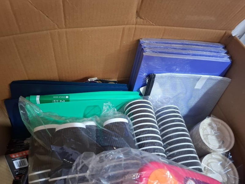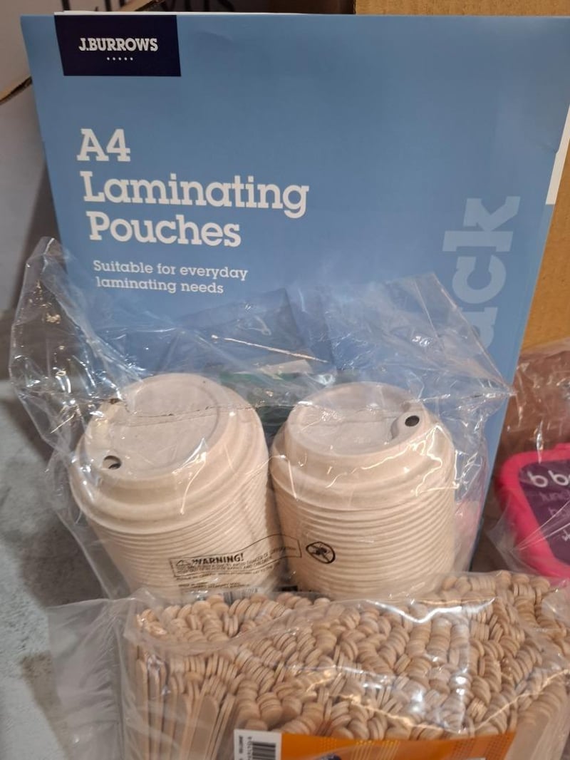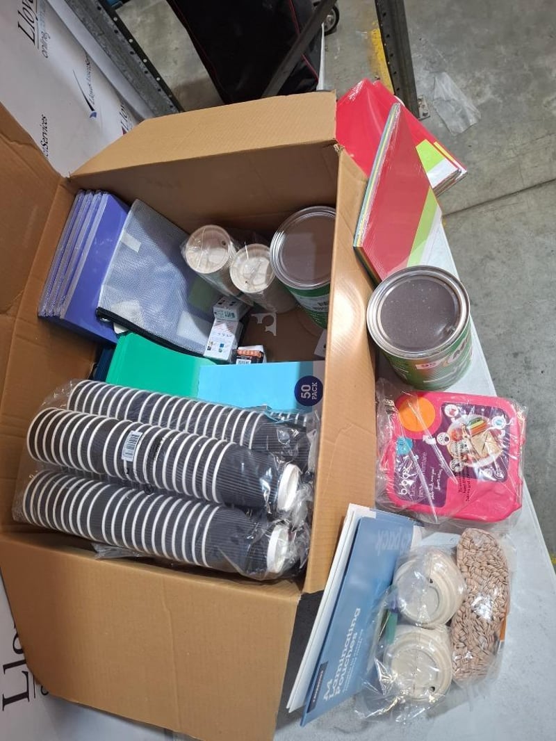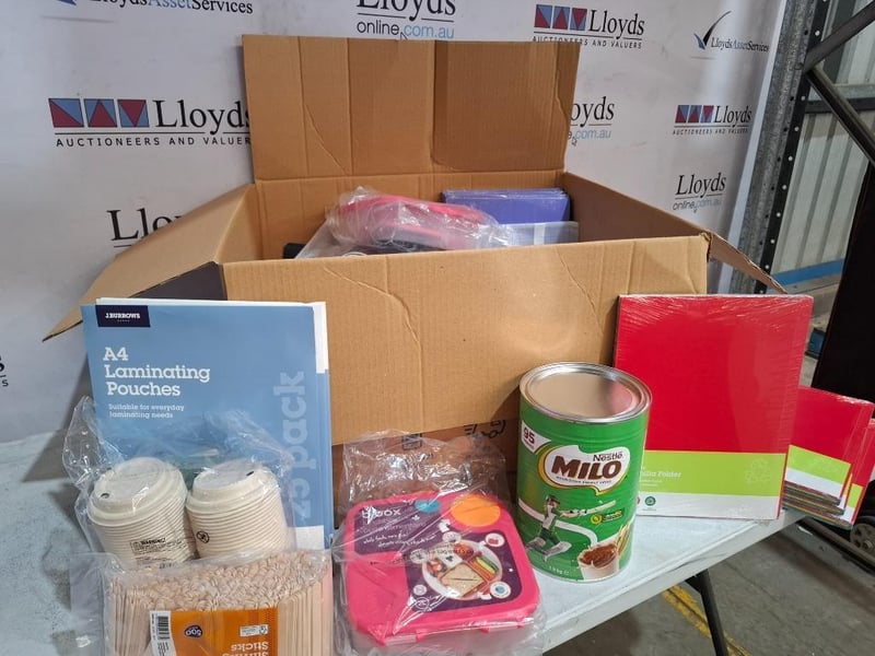 Assorted Items Including Paper Cups, Laminating Pouches, B Box Lunch Box, Stiring Sticks, Milo, And MoreNote: Items May Have Water Damage