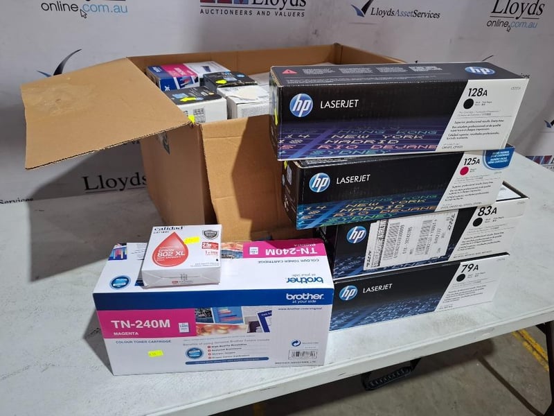 Assorted Ink Cartridges Including, Brother Tn-240M, Hp 79A Black, Hp 128A Yellow, Calidad Epson 802 Xl And MoreNote: Items May Have Water Damage