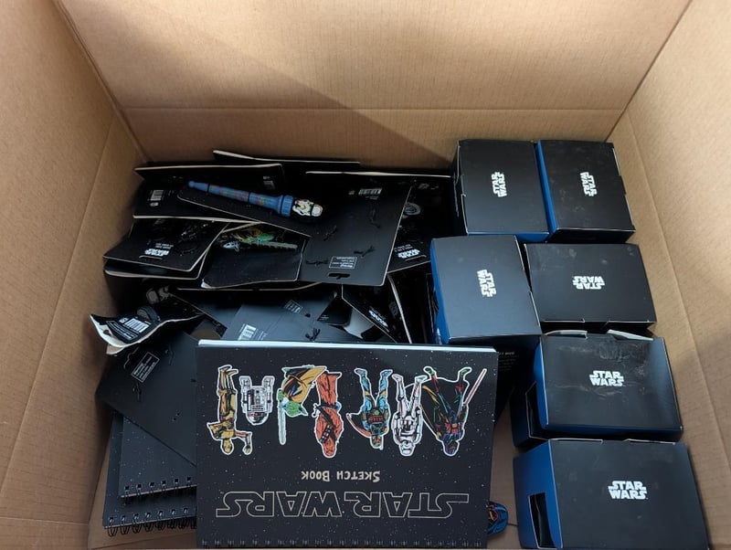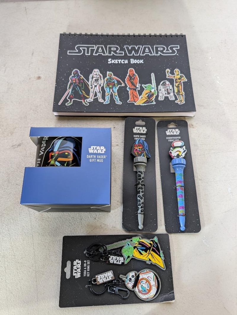Assorted Items Including Star Wars Sketch Book, Star Wars Darth Vader Gift Mug, StormTrooper Fidget Pen And MoreNote: Items May Have Water Damage