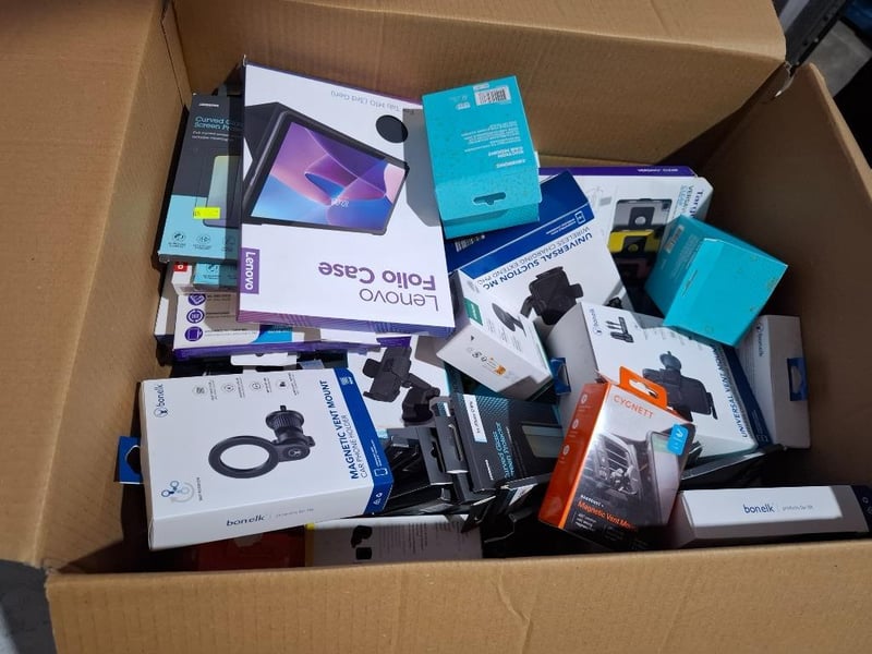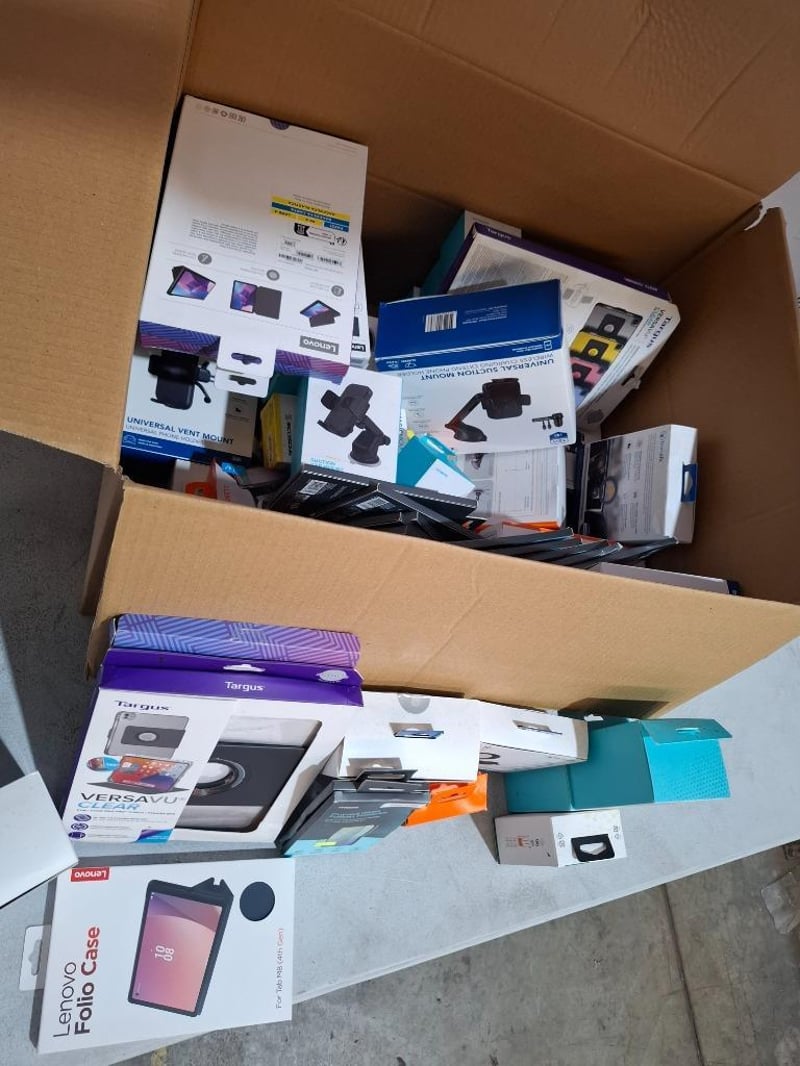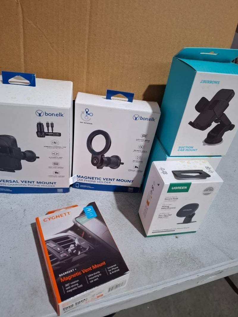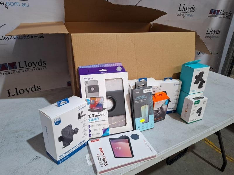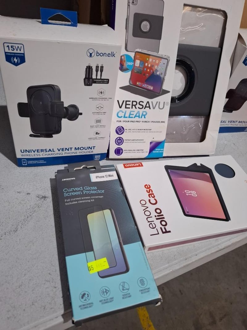 Assorted Items Including Universal Vent Mount Wireless Charging Phone Holders, Targus Clear Case For Ipad 11, Iphone 12 Min Curved Screen Protector, Suction Car Mount, Magnetic Vent MountNote: Items May Have Water Damage