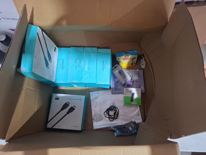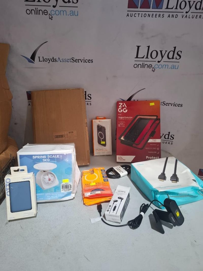 Box Of Assorted Items Including Cygnett Clear Magnetic Case for iPhone 16 Pro Max, J.Burrows USB Web Cab, 7 × 10m High Speed HDMI Cables, Otto 5000mAh Powerbank, and MoreNote: Items may have Water Damage.