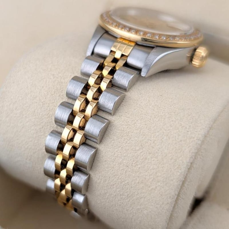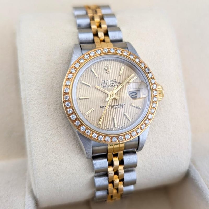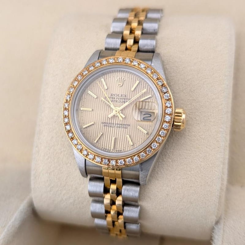 ROLEX 69173 LADY-DATEJUST TAPESTRY DIAL & CUSTOM DIAMOND BEZEL 26MM 1990 Brand: RolexReference: 69173Model: Lady-Datejust – Champagne Tapestry Dial, Custom Diamond BezelCase Size: 26MmCirca: 1990, E-SerialMovement: AutomaticCondition: Good VintageBox: NoPapers: No Condition: Good488414+5
