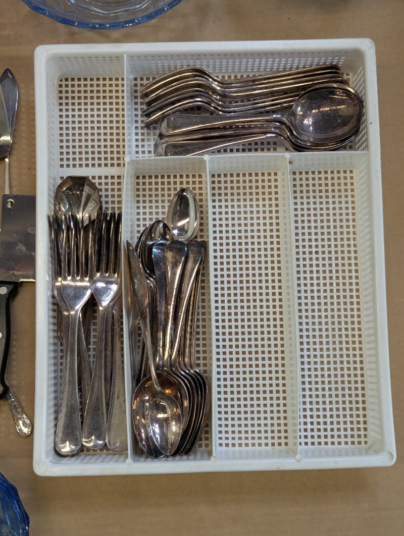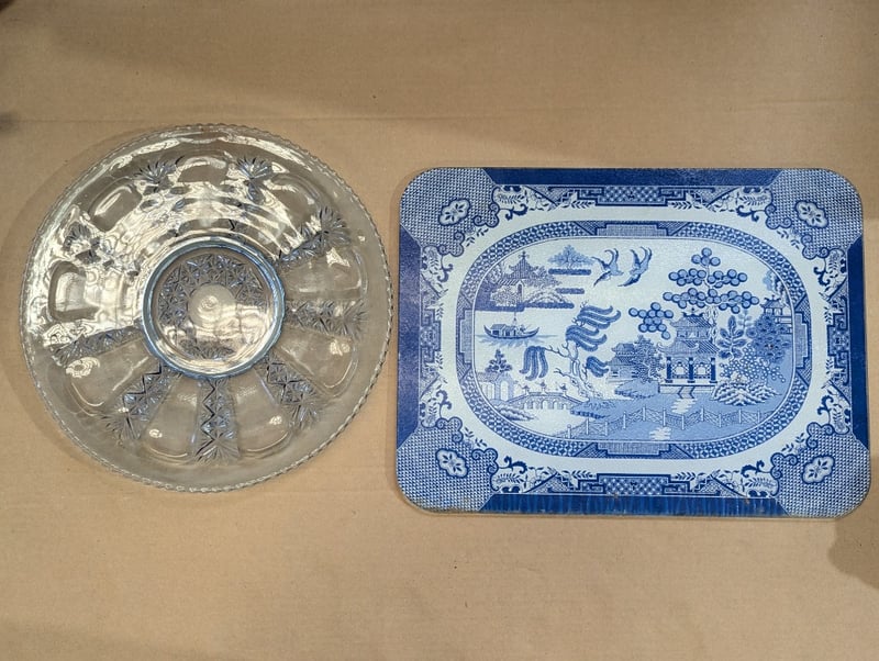 COLLECTION OF HOME AND TABLEWARE ITEMSIncludes Plates And Board With Chinese Blue Imagery, Glass Bowls And Serving Trays, Collection Of Cooking Utensils And Cutlery585003+7