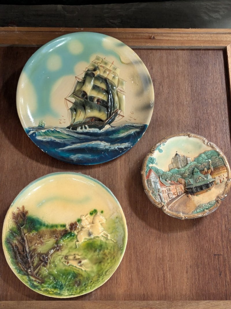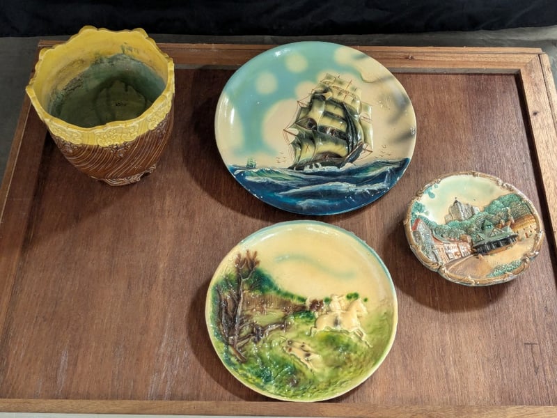 THREE DECORATIVE WALL PLATES AND MAJOLICA-STYLE JARDINIERE