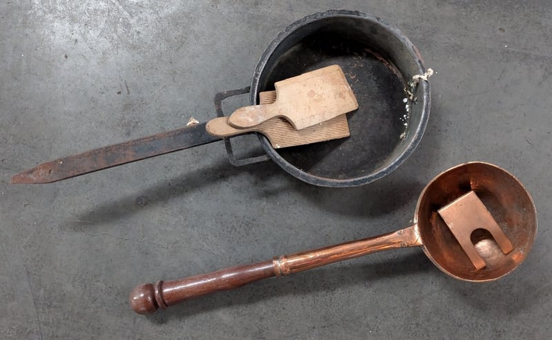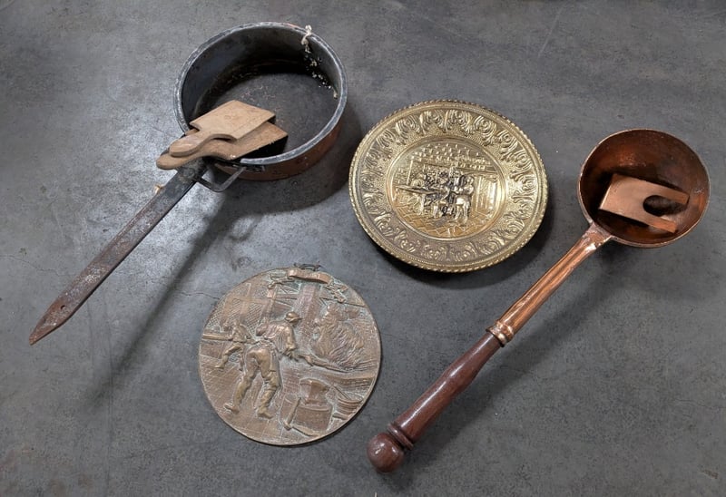 Includes Long Handled Copper Bed Warmer Pan, Brass And Wooden Ladel, Two Wall Hangings
