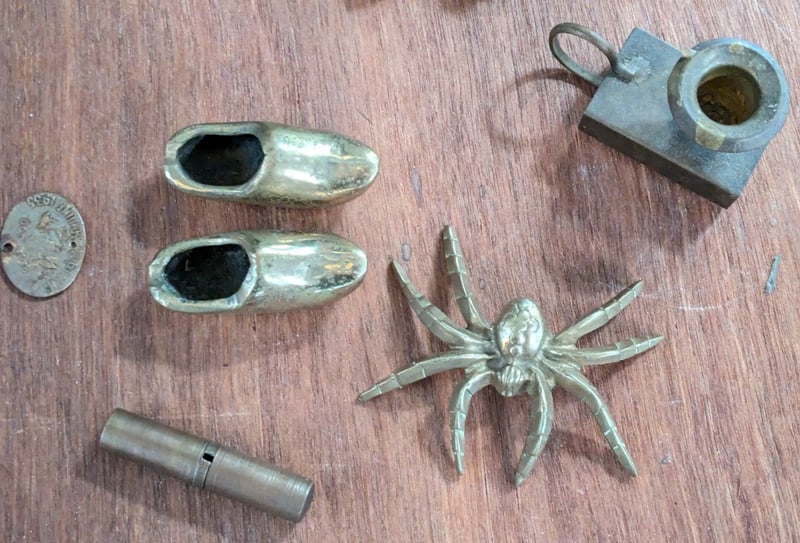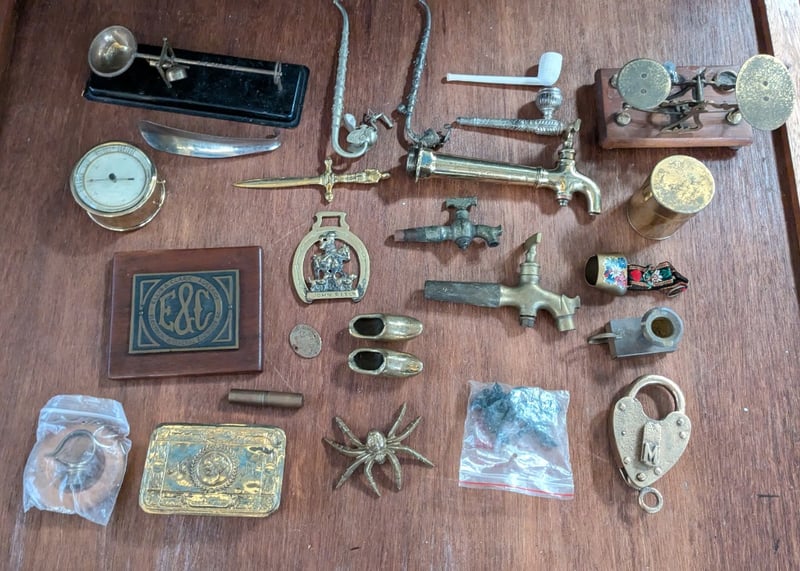COLLECTION OF BRASS AND METAL ESTATE ITEMSThe Collection Includes, Small Clock/Barometer, Miniature Brass Clogs, Letter Opener, And Several Mechanical Parts, EtcCondition: Fair - Refer To Images585003+46