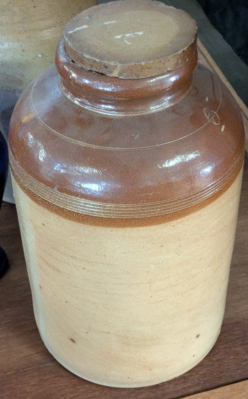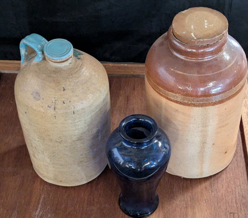 TWO STONEWARE JARS AND ONE GLASS VASE