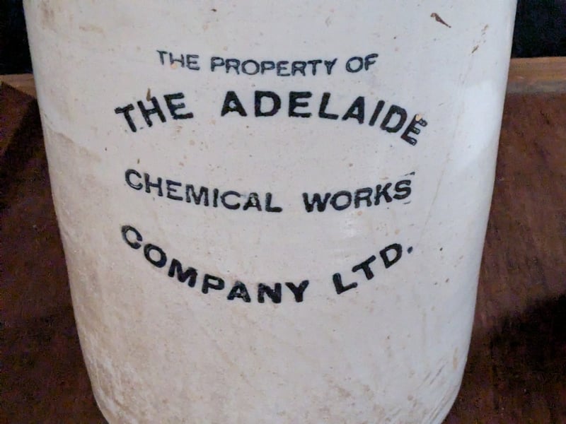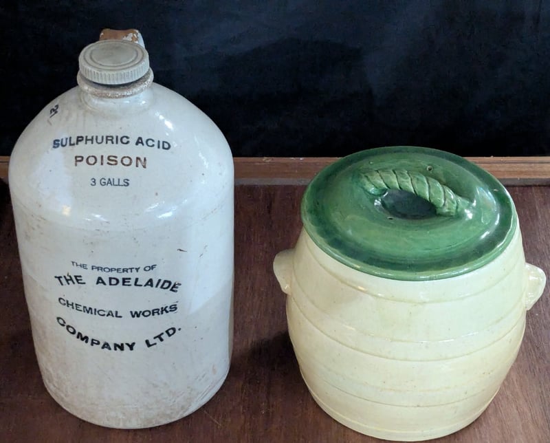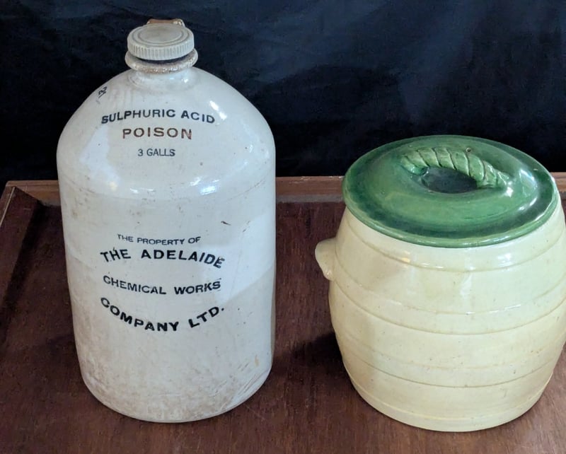 ADELAIDE CHEMICAL WORKS COMPANY 3 GALLON POTTERY DEMIJOHN AND ONE STONEWARE POT