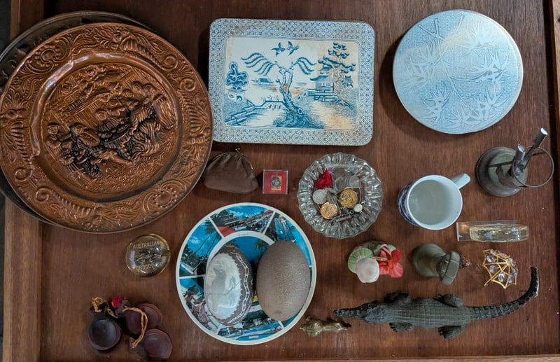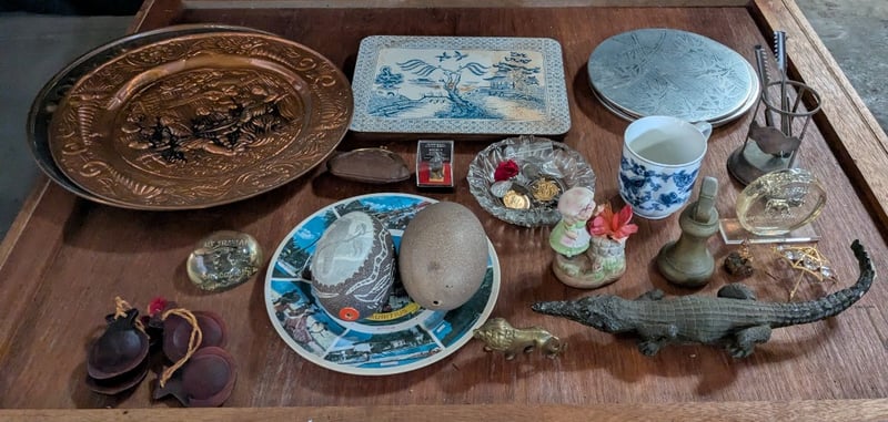 Includes Two Hollow Emu Eggs, Pair Of Castanets, Various Pennies And Medals, Table Placemats, Etc