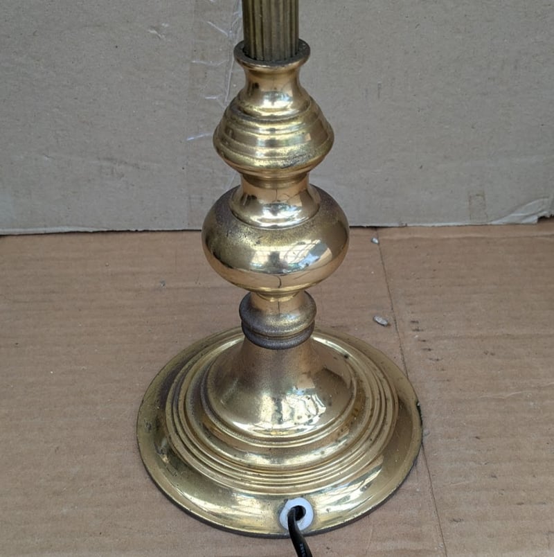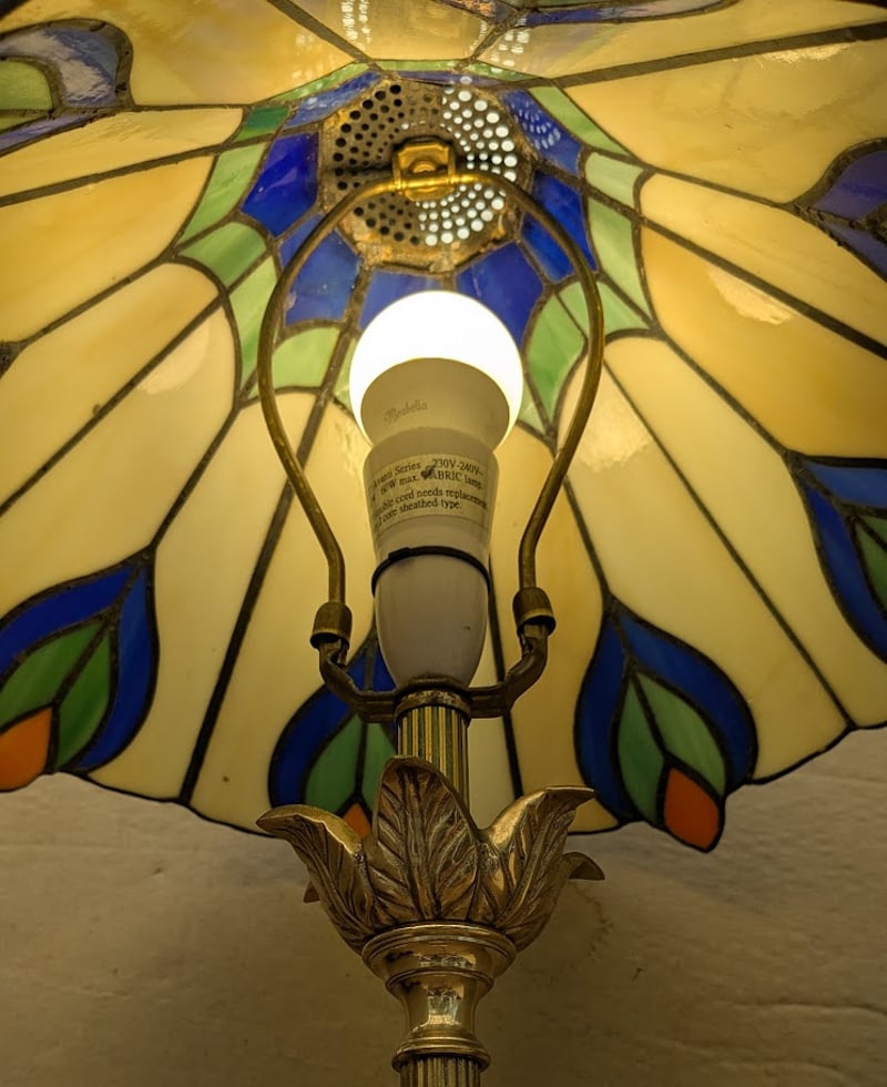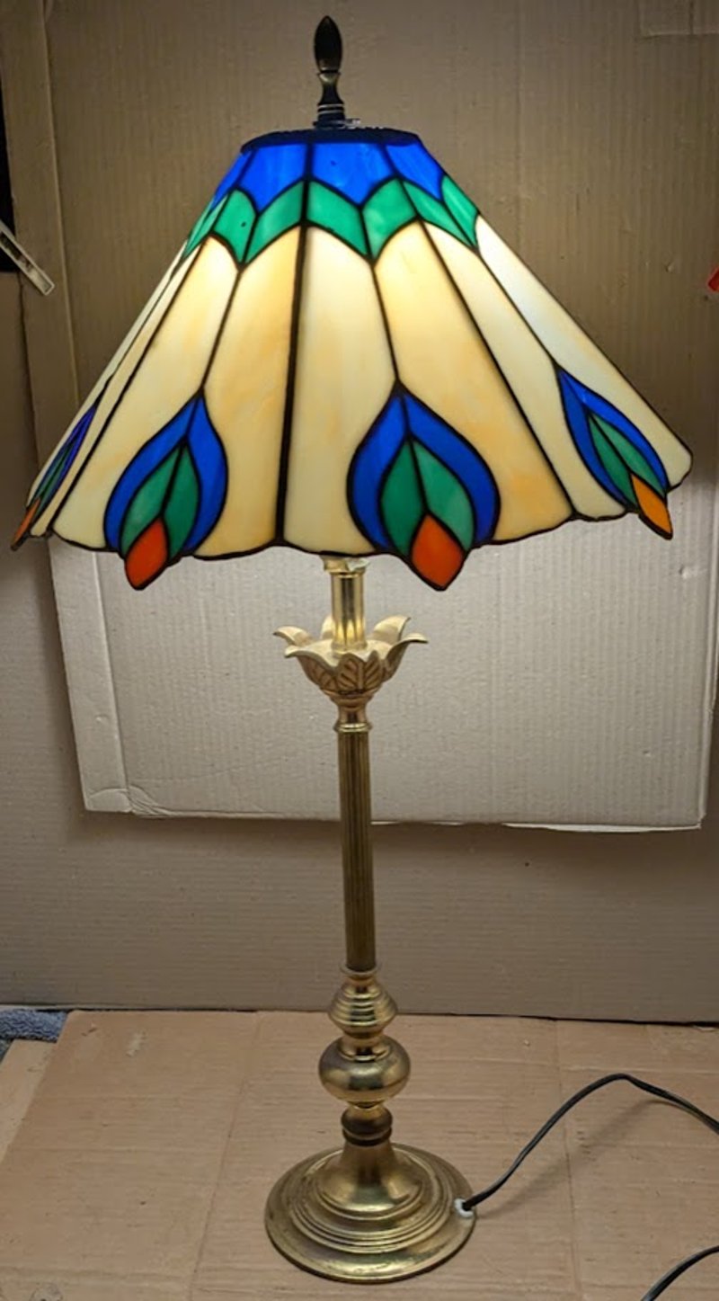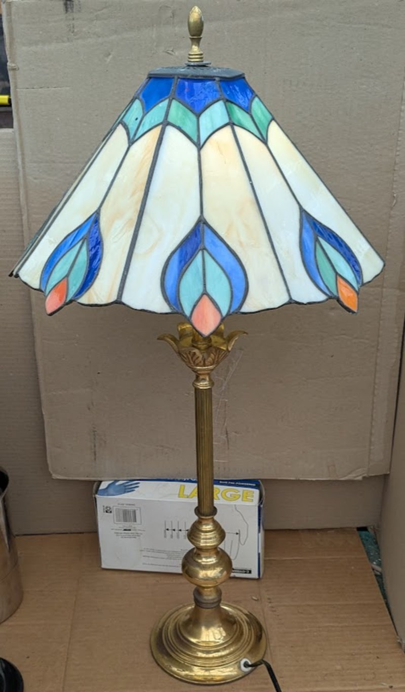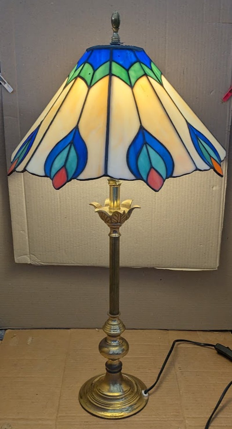 VINTAGE LEADLIGHT TABLE LAMP WITH BRASS STEM AND BASE