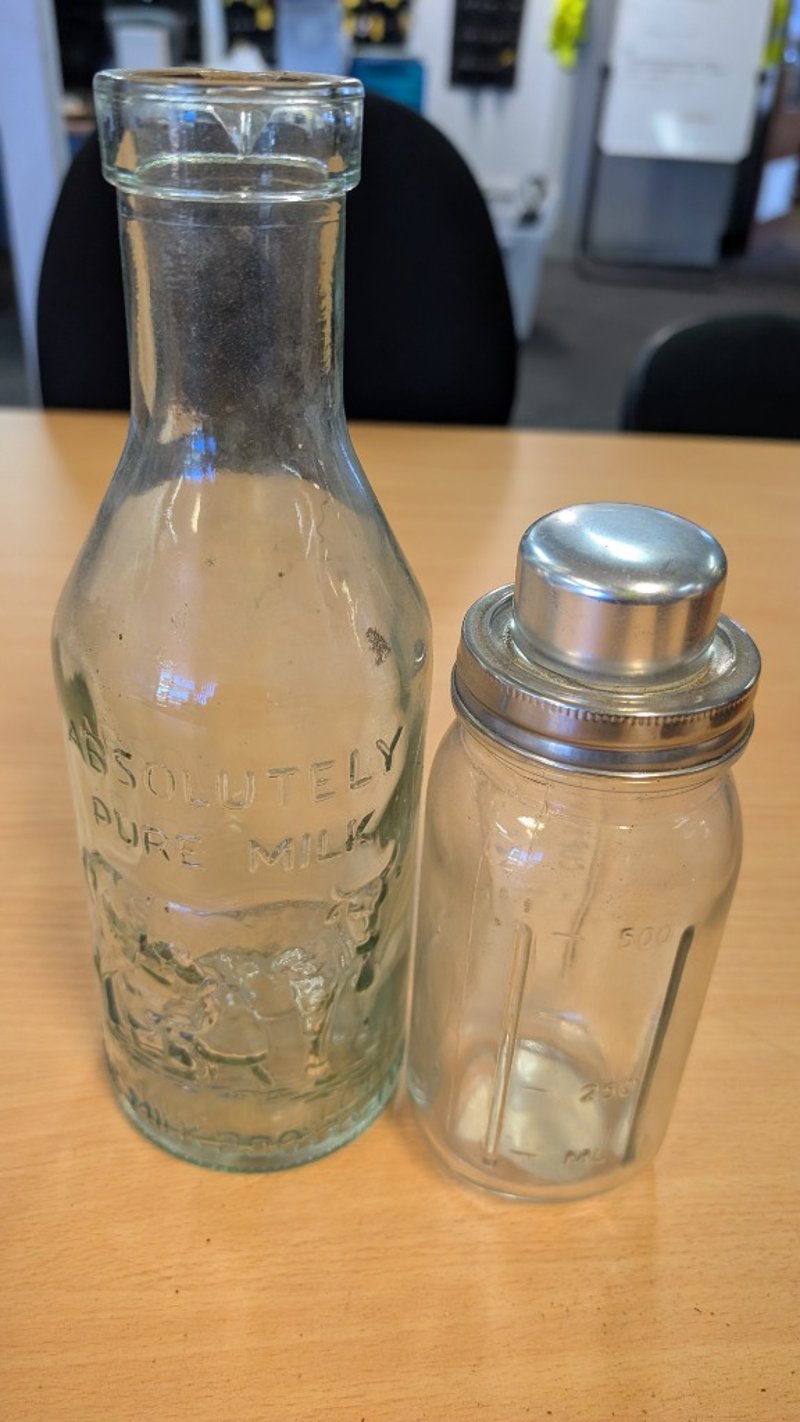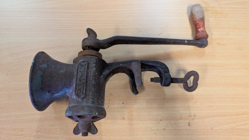 ASSORTED VINTAGE ITEMS INCLUDING GLASS BOTTLES, MEAT GRINDER AND MORE