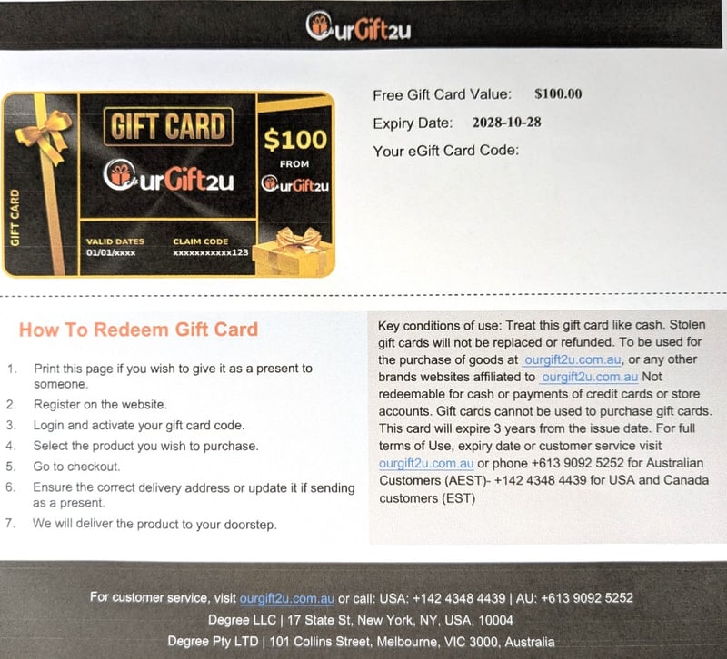 Accompanied By Insurance Valuation Assessment And $100 X 3 Gift Card, Ourgift2U.