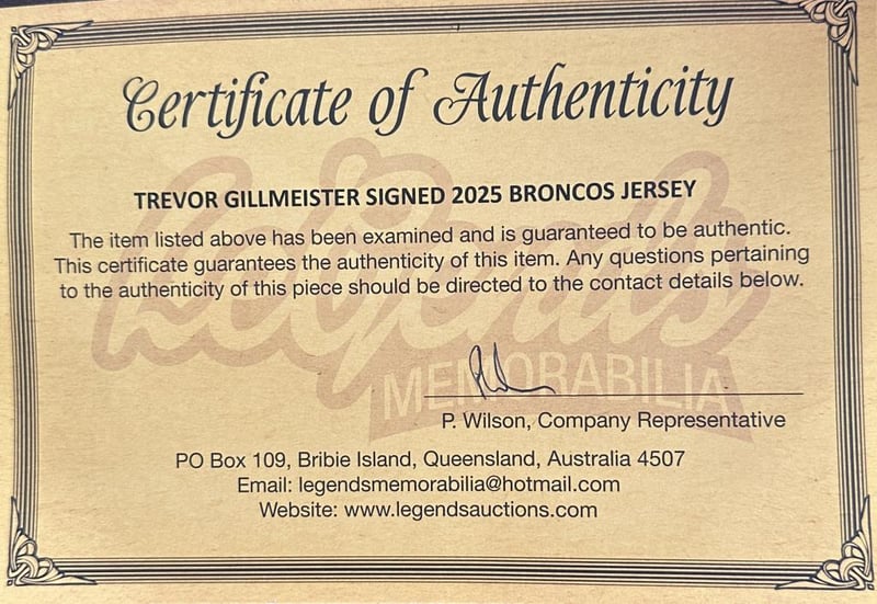 A 2025 Brisbane Broncos Jersey Personally Signed By Trevor Gillmeister. Trevor Gillmeister Is A Former Australian Professional Rugby League Footballer. The Item Is Accompanied By A Certificate Of Authenticity.