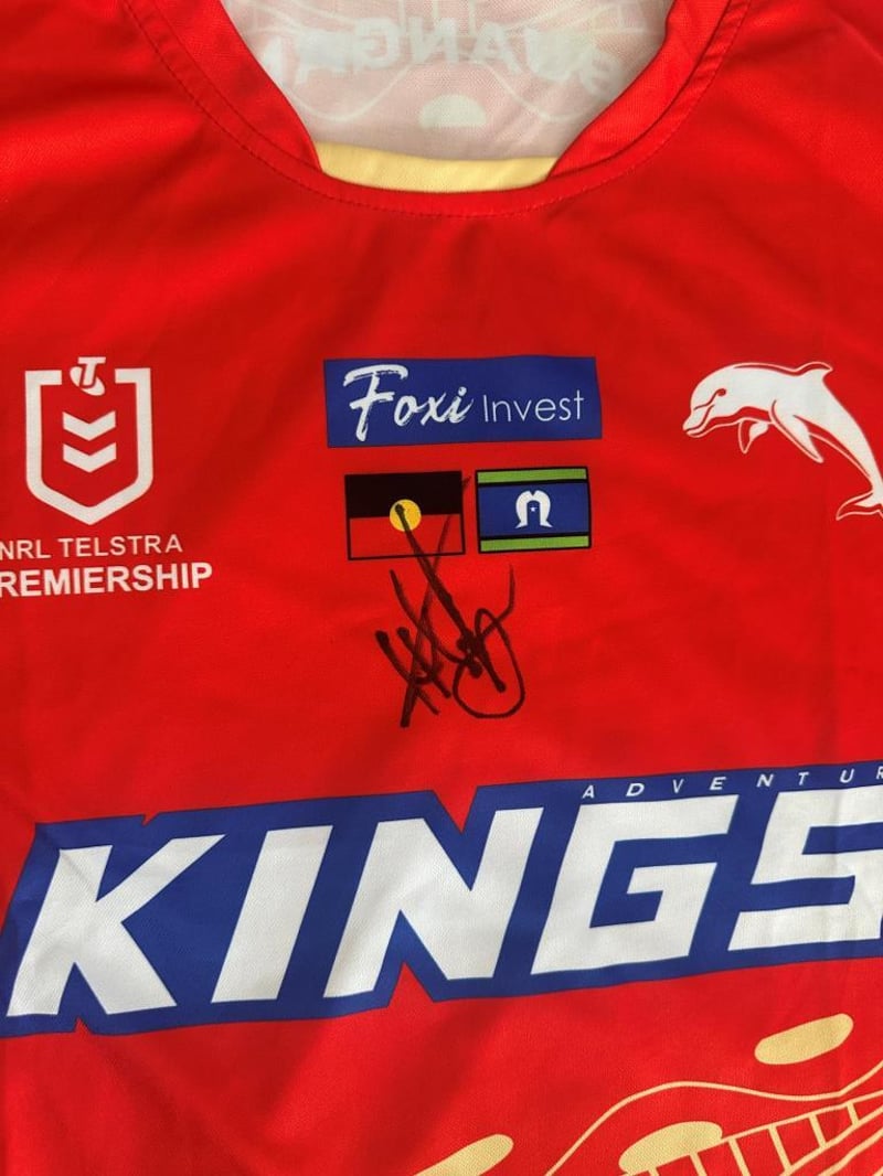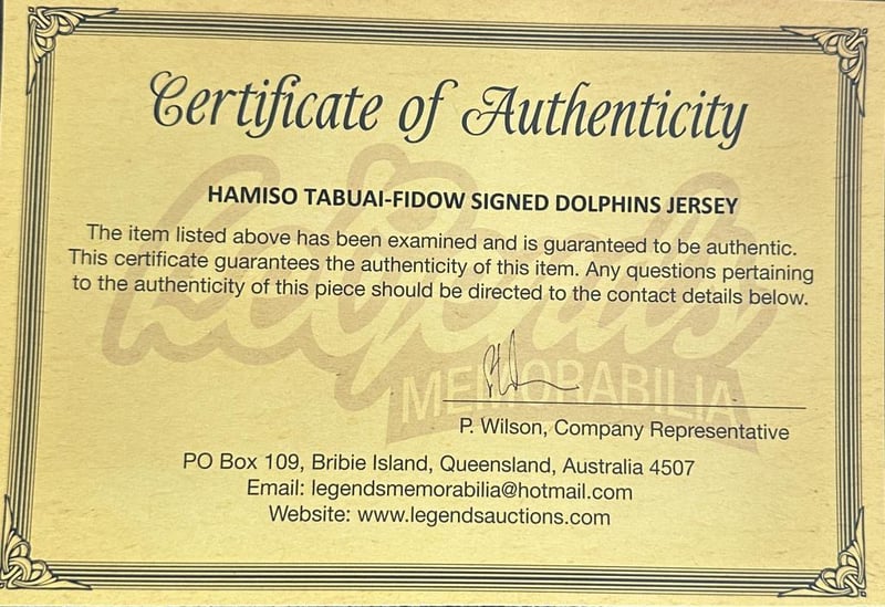 A Dolphins Jersey Personally Signed By Hamiso Tabuai-Fidow. Hamiso Tabuai-Fidow, Nicknamed "Hammer", Is A Professional Rugby League Footballer Who Plays As A Fullback For The Dolphins In The Nrl. The Item Is Accompanied By A Certificate Of Authenticity.
