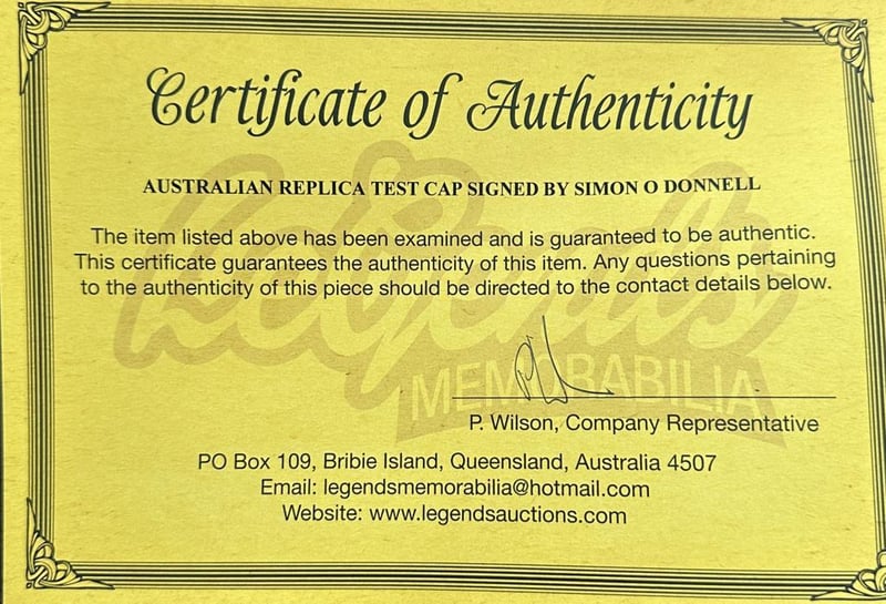 An Australian Replica Test Cap Personally Signed By Simon O'Donnell. Simon O'Donnell Is An Australian Former Cricketer, Vfl Footballer, And Horse Racing And Cricket Commentator. The Item Is Accompanied By A Certificate Of Authenticity.