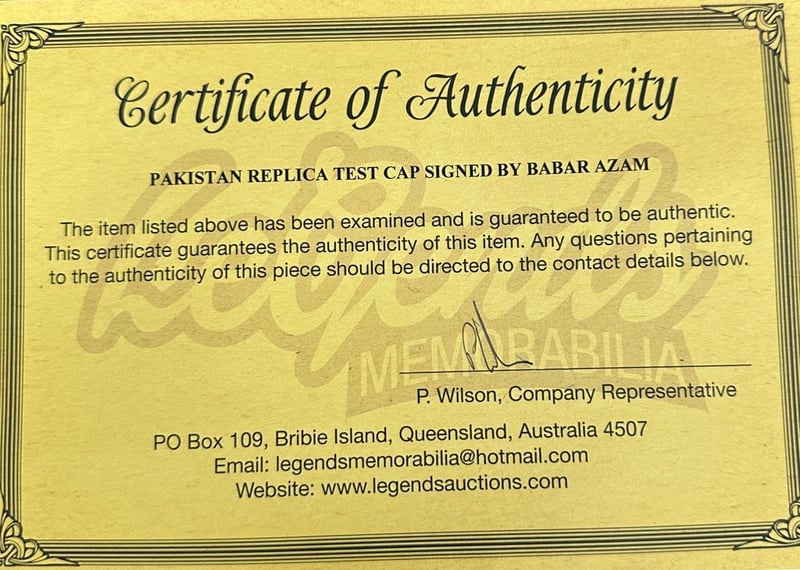 A Pakistan Replica Test Cap Personally Signed By Babar Azam. Babar Azam Is A Pakistani International Cricketer And A Former Captain Of The Pakistan National Team In All Three Formats Of The Game. The Item Is Accompanied By A Certificate Of Authenticity.