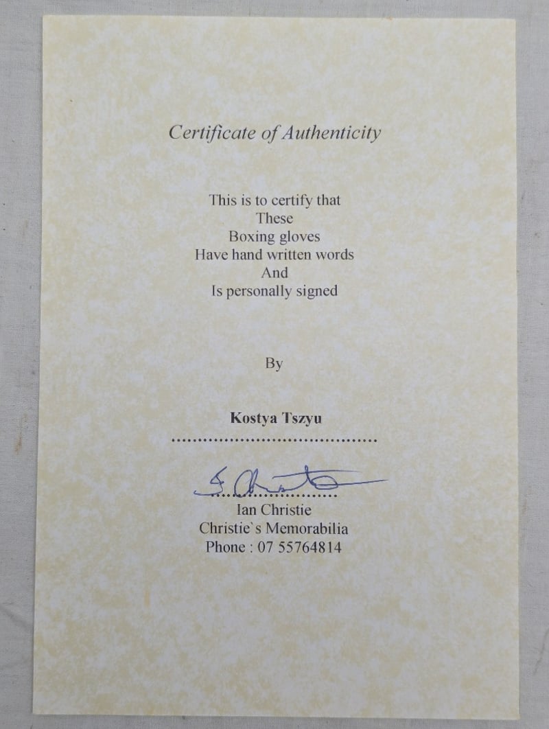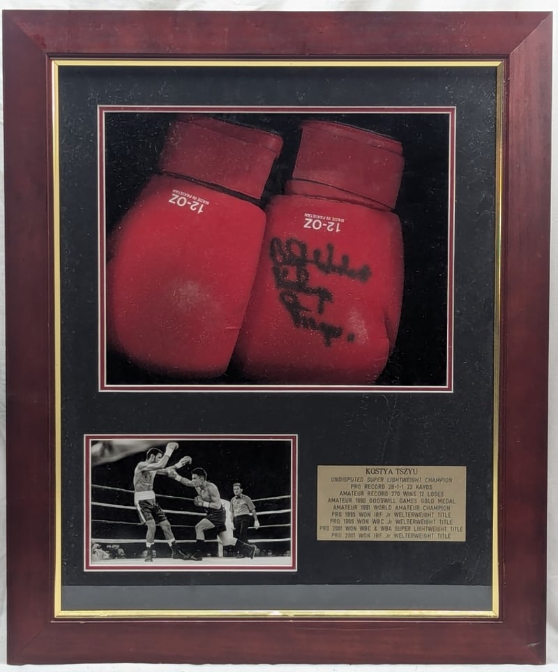 KOSTYA TSZYU SIGNED BOXING GLOVESItem Size: Height: 65cm, Width: 54cm, Depth: 12cmGloves In Display Case With Photo And Plaque Listing Kostya Tszyu Pro Record And TitlesIncludes Certificate Of AuthenticityCondition: Good - Refer To Images3B587761+37