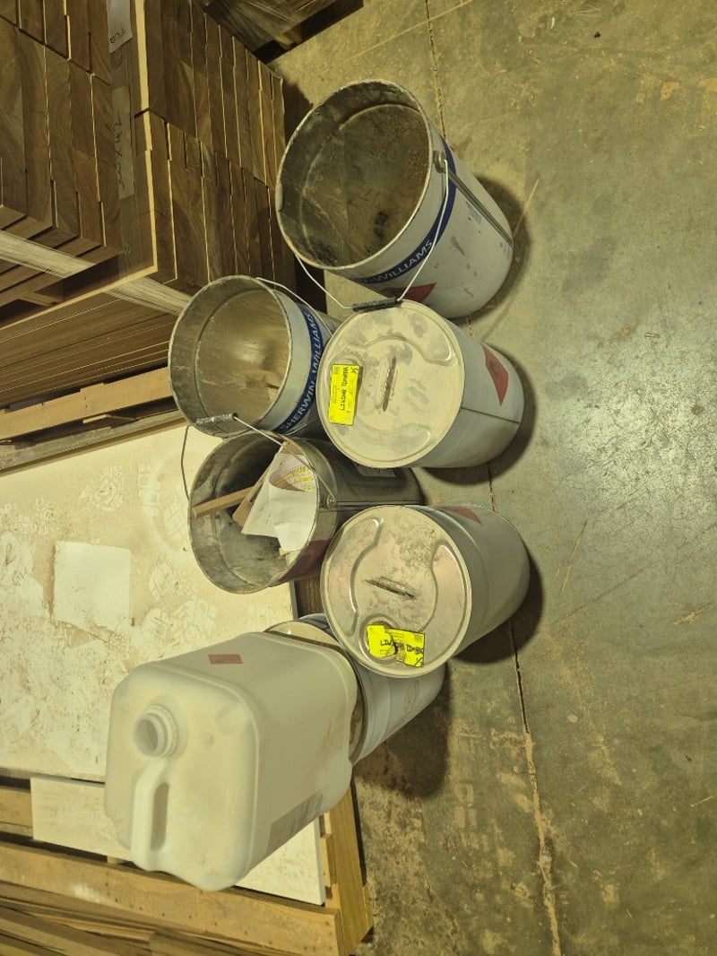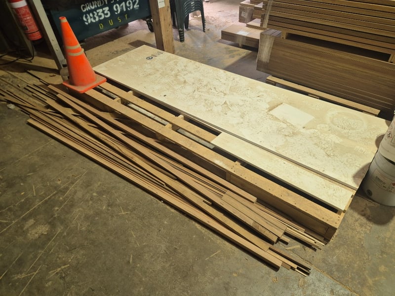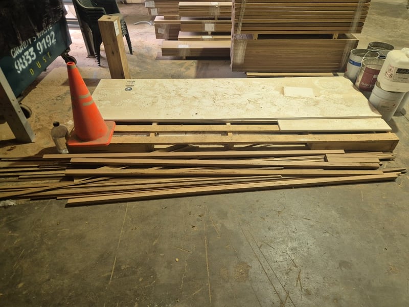 Assorted Timber Dowling Double sized Pallet 2400x1200x1200 White Glossed/Acrylic Wooden Board Panel Assorted Buckets Sold as Lot